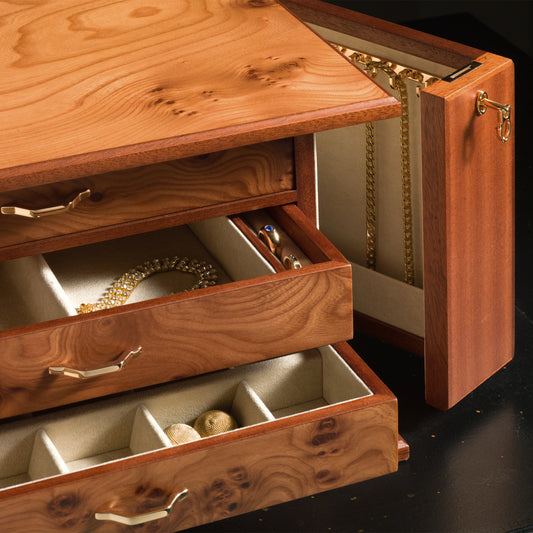 Jewelry chest in briar and mahogany, matte finish, ultrasuede lining. 24 karats gold platedbrass accessories. With 4 drawers. Two lockable doors with necklace bars. Chest measurements cm. 40x25x25Weight kg. 7,5- £1,900.00