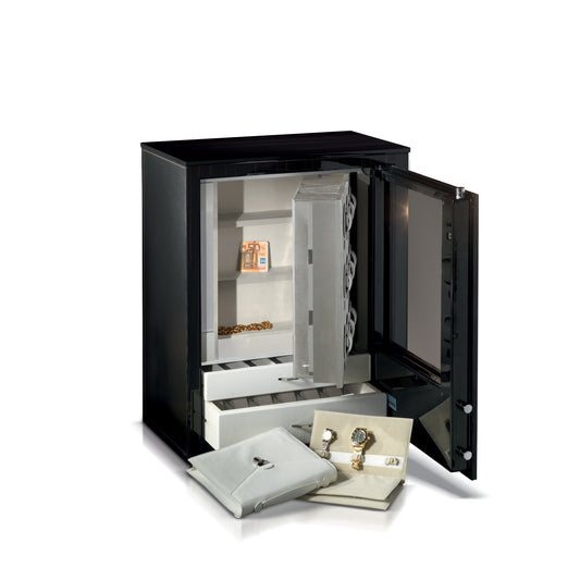 A safe jewelry cabinet in glossy ebony, with ruthenium accessories. The safe is opened viaan integrated round handle, featuring a biometric reader and an emergency key.Battery-operated, it offers both practicality and security. In the upper section, a bust for necklaces and removable trays for jewelry, lined with suede fabric, provide...- £63,000.00