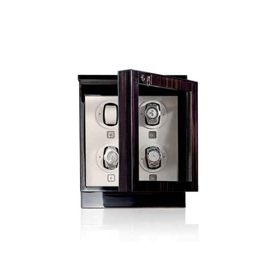 Polished ebony chest with 4 watch winders entirely made in Switzerland, lined in leather, touch switch, glass door. Ruthenium finish brass accessories. Measures cm. 28,6x28x36,5kg. 7,8- £9,885.00