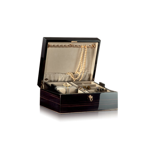 Jewellery box with removable tray, lockable, lined for earrings, rings, necklaces. Polished ebony. Box measures cm. 32,2x27,1x14- £1,535.00