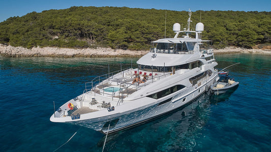 Custom Line | 32.99m | 2020 Length 32.99m / 108ft Beam 7.68m / 25ft Draft 2.18m / 7ft Builder Custom Line Year 2020 Material Grp Guests 11 Cabins 5 Crew 6 Speed 12 / 15 Knots Engines 2 X Man 1,400 Hp -