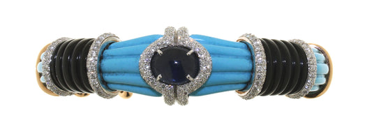Rose gold bangle with diamonds, turquoise, onyx and blue sapphires. All our turquoise and onyx are reconstructed and ecological. 18 kt rose gold gr. 66.00 (weight may differ from one another) ...- £27,215.00