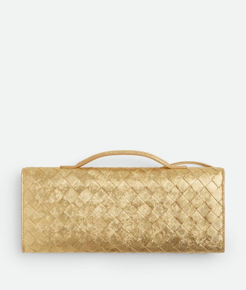• Intrecciato lamina satin leather top handle clutch with metallic knot closure