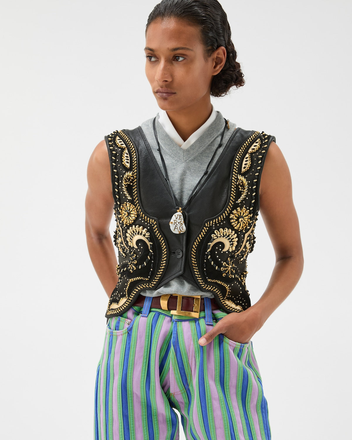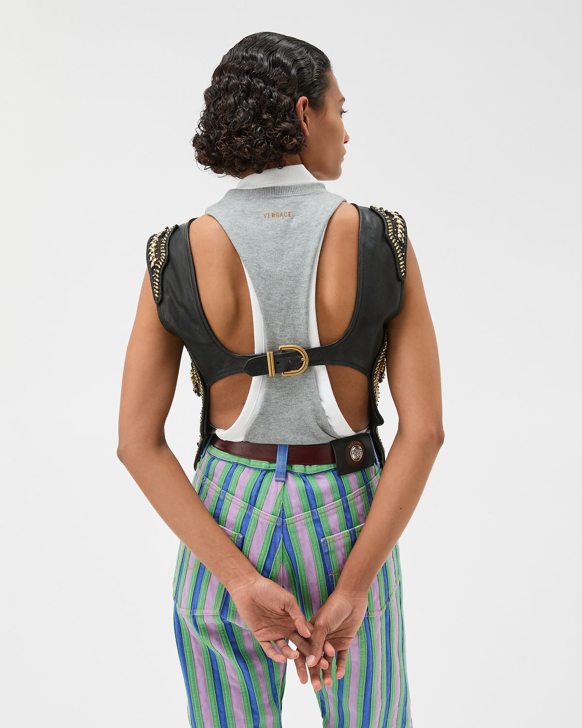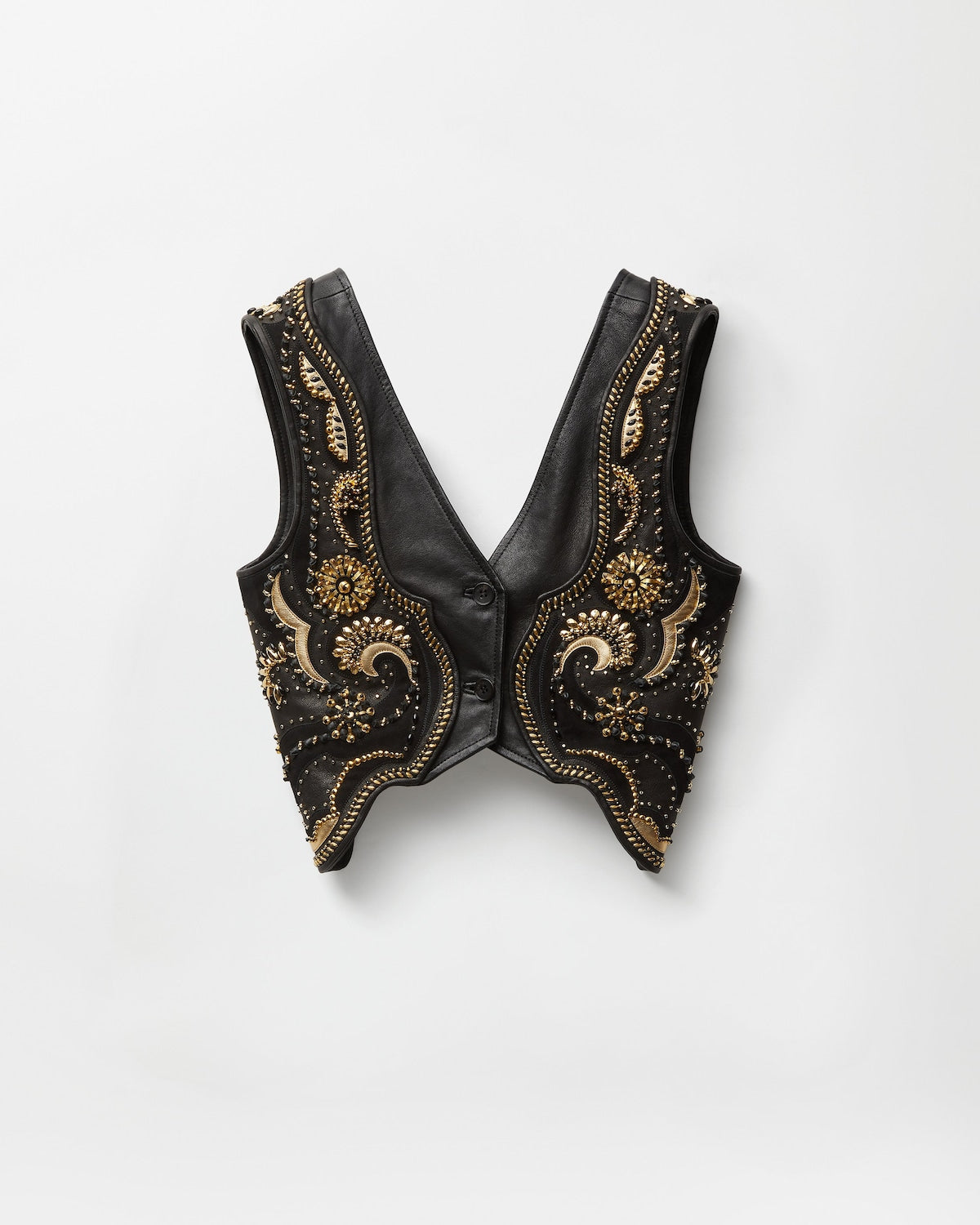 This embroidered open-back vest is crafted entirely from nappa leather with suede and metallic laminated inserts. It features classic embellishments—such as bugle beads, crystals, and paillettes (originally used by Gianni Versace)—which have been remastered and hand-stitched. The style is complete with a D-ring buckle closure at the back.