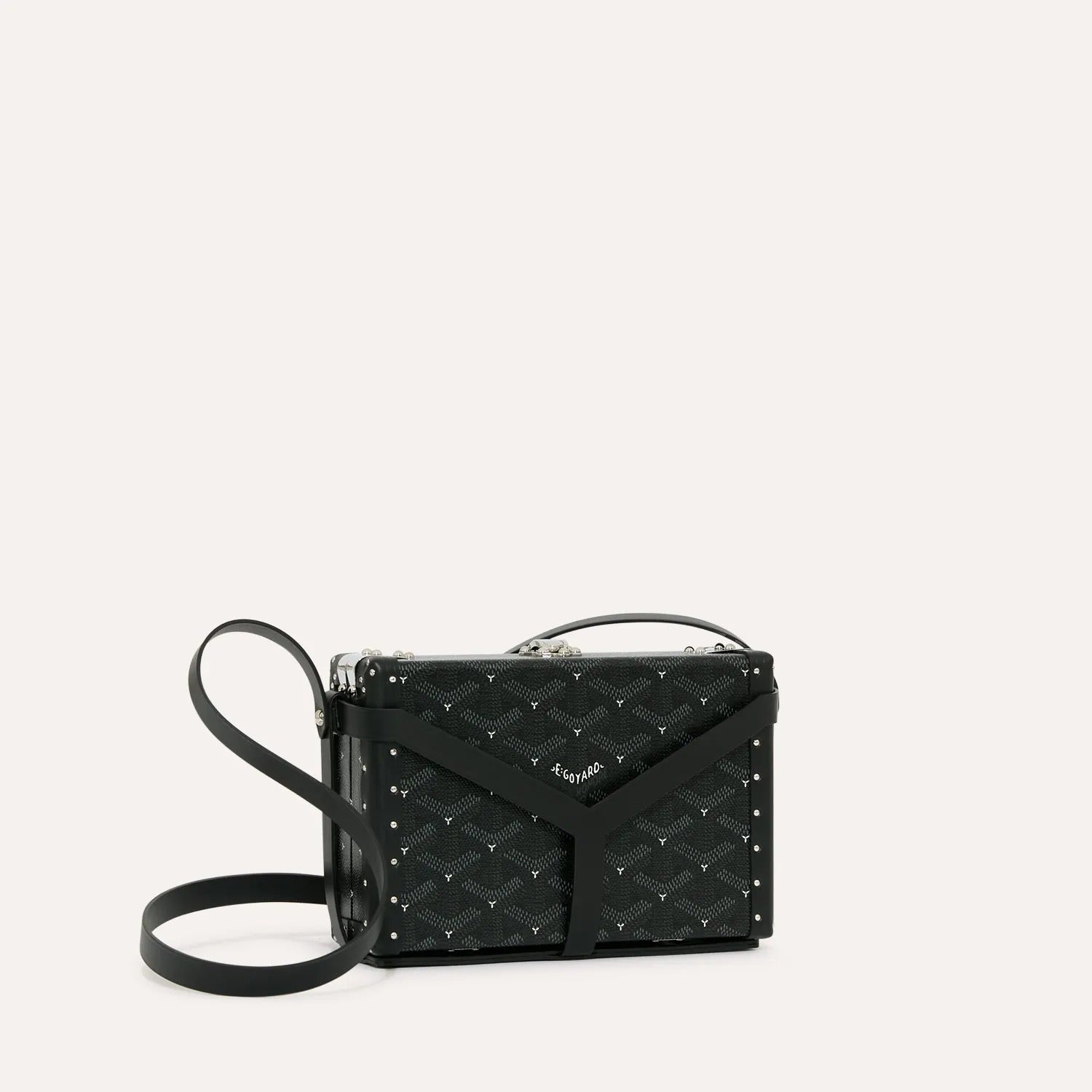 The Minaudière trunk bag dresses up in a new exclusive deep-dark "Capitonnage" Goyardine canvas, subtly contrasted with smaller white chevrons, as a nod to the quilting of our historic trunks. It can be worn over the shoulder, cross-body style or carried by hand with its leather strap that echoes the Y-shaped chevron from our Goyardine canvas.
