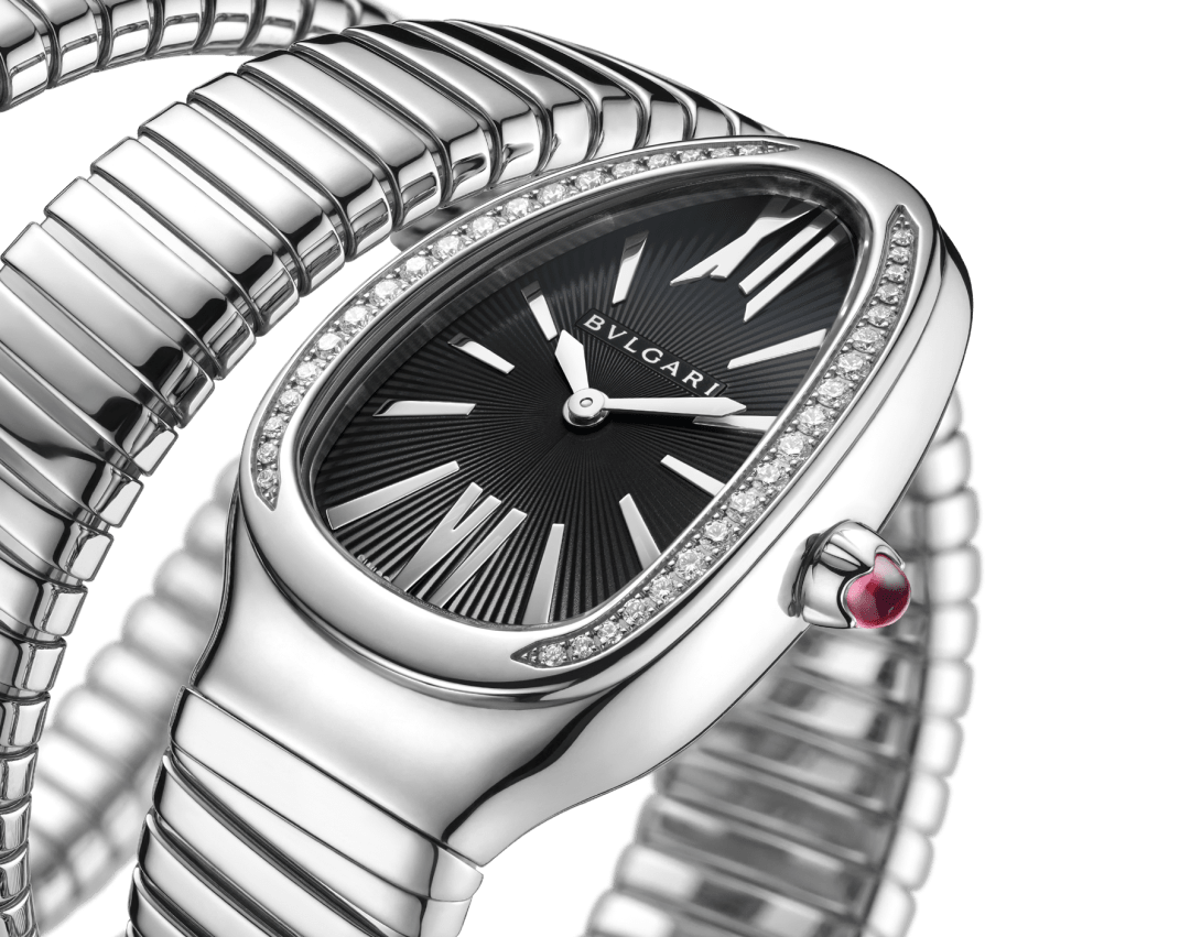 Merging two of the most iconic emblems of Bvlgari design, the Serpenti Tubogas watch coils the sinuosity of the snake with the contemporary soul of tubogas. Crafted with a flexible and tubular litheness, the timepiece evokes both the seductive power of the serpent and the fluid shape of its wrapping body, representing a spellbinding encounter between irresistible glamour and distinctive jewellery design.