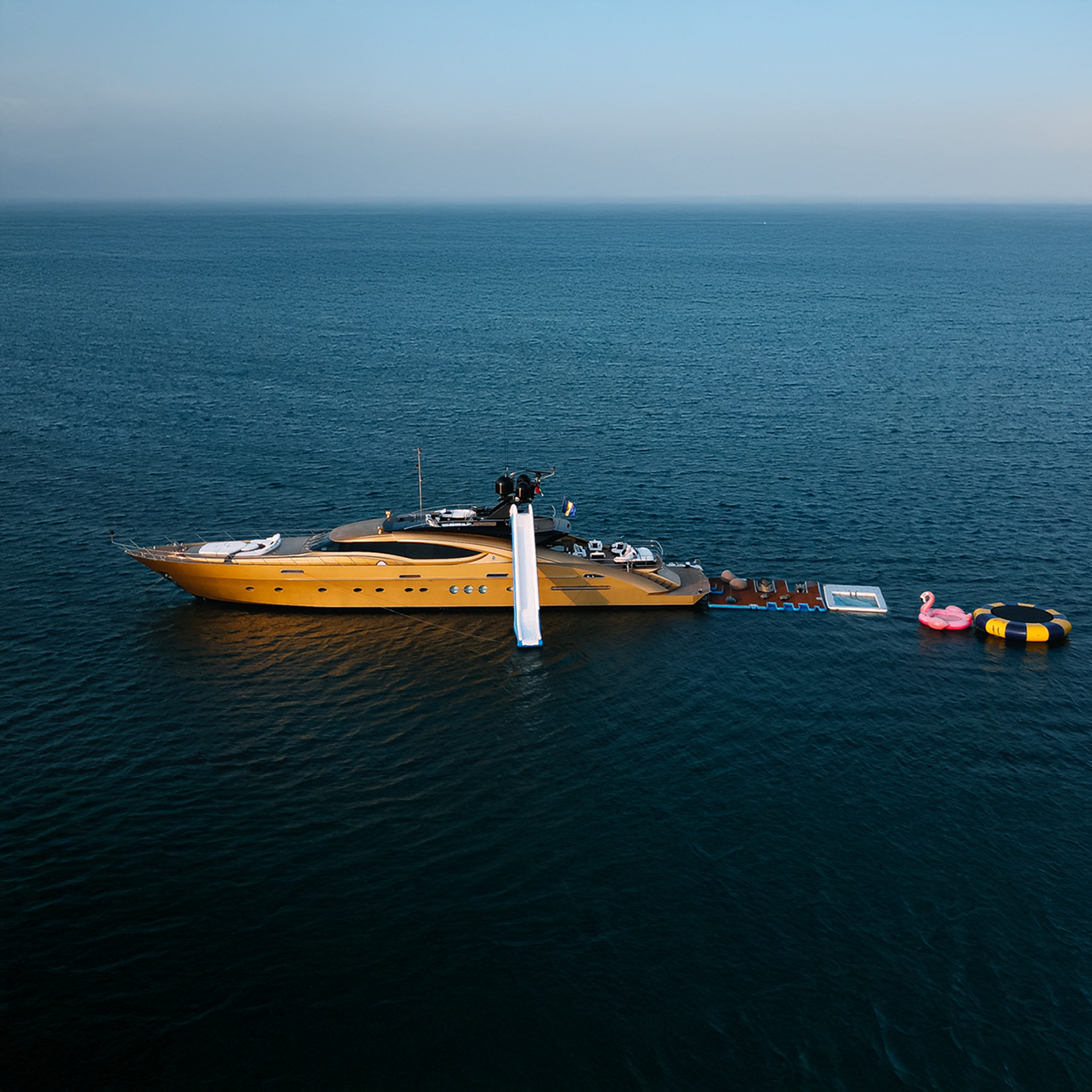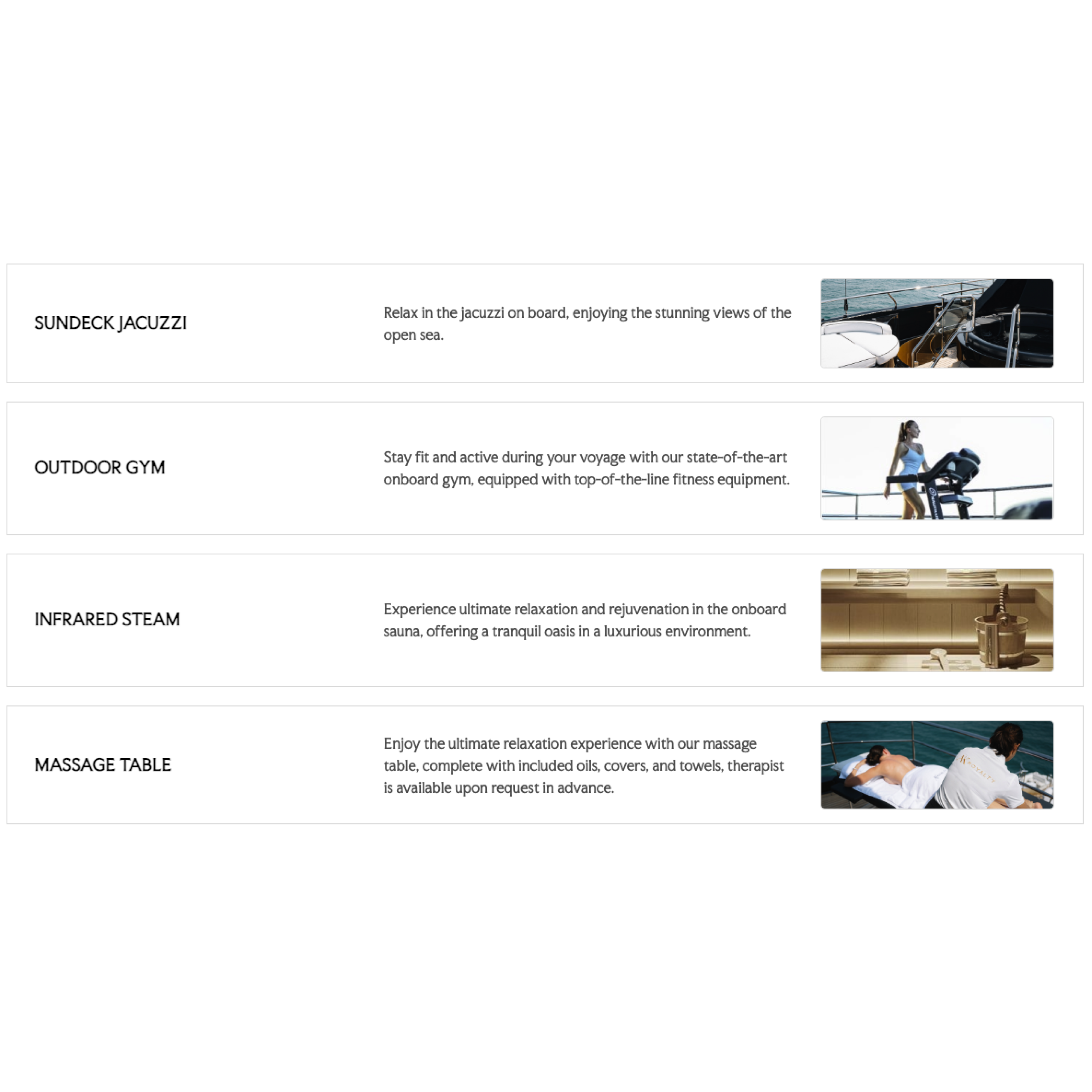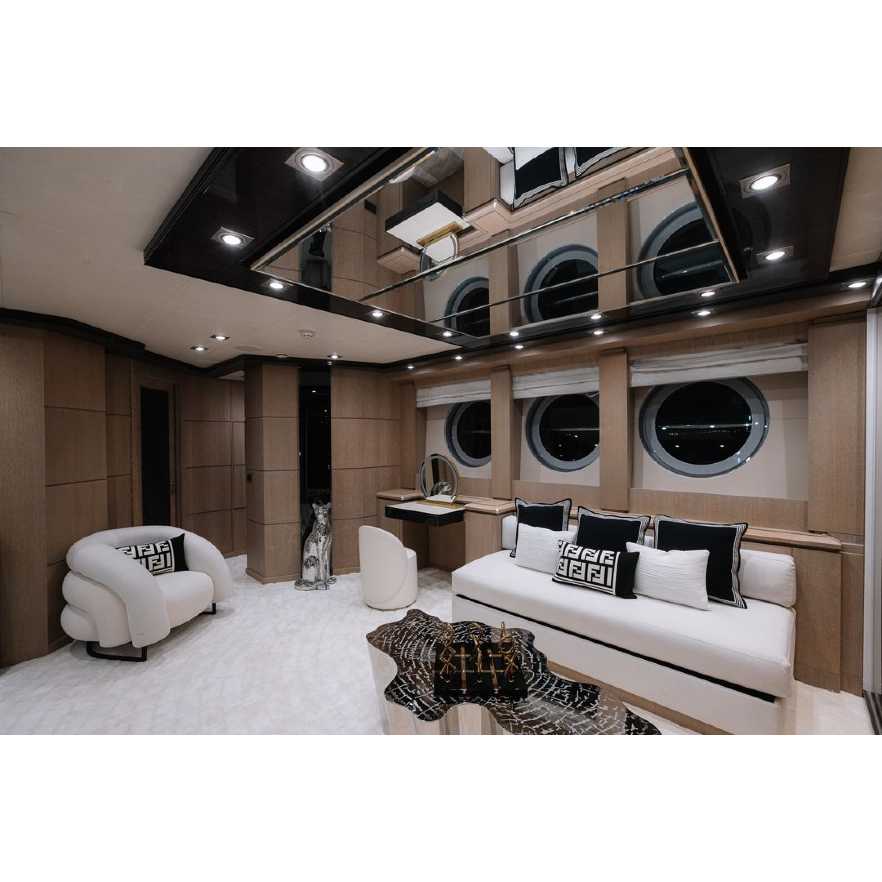 At 42 meters(137 ft) in overall length, super yacht “AK Royalty” comfortably accommodates 12 guests along with 7 crew. Equipped with a spacious entertainment areas across two decks and optional indoor and outdoor dining, jacuzzi, outdoor gym and even cinema under the stars, she has everything you are looking for.