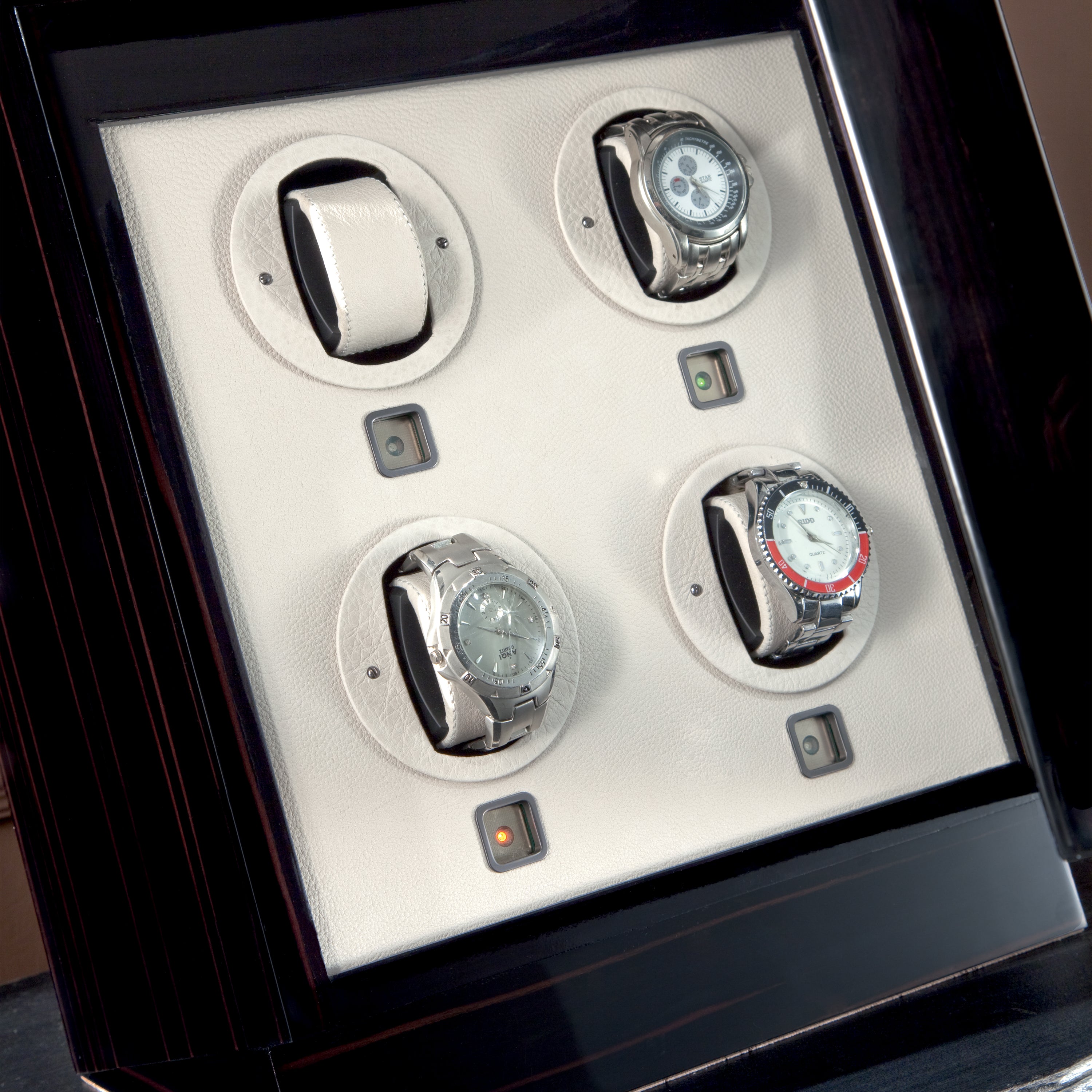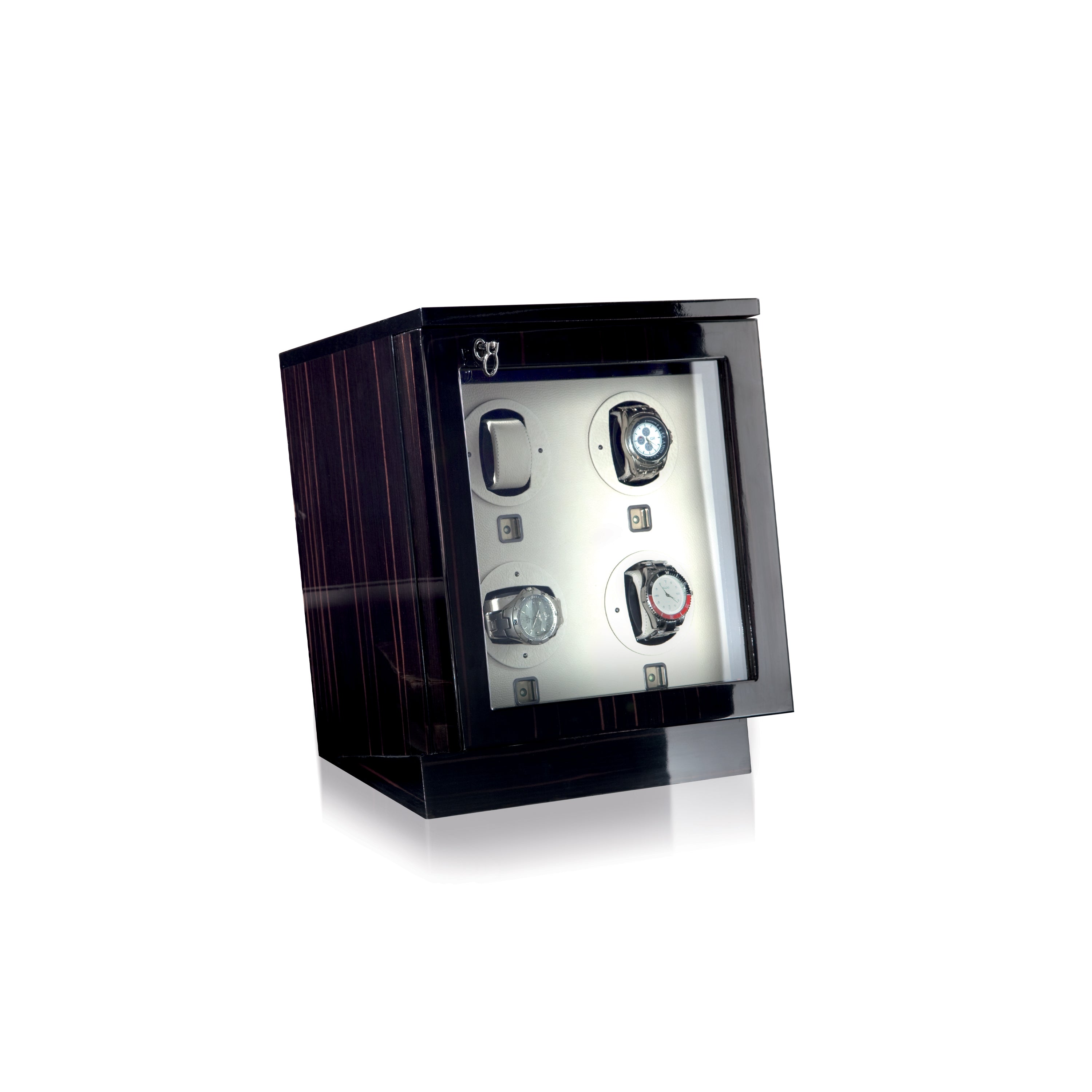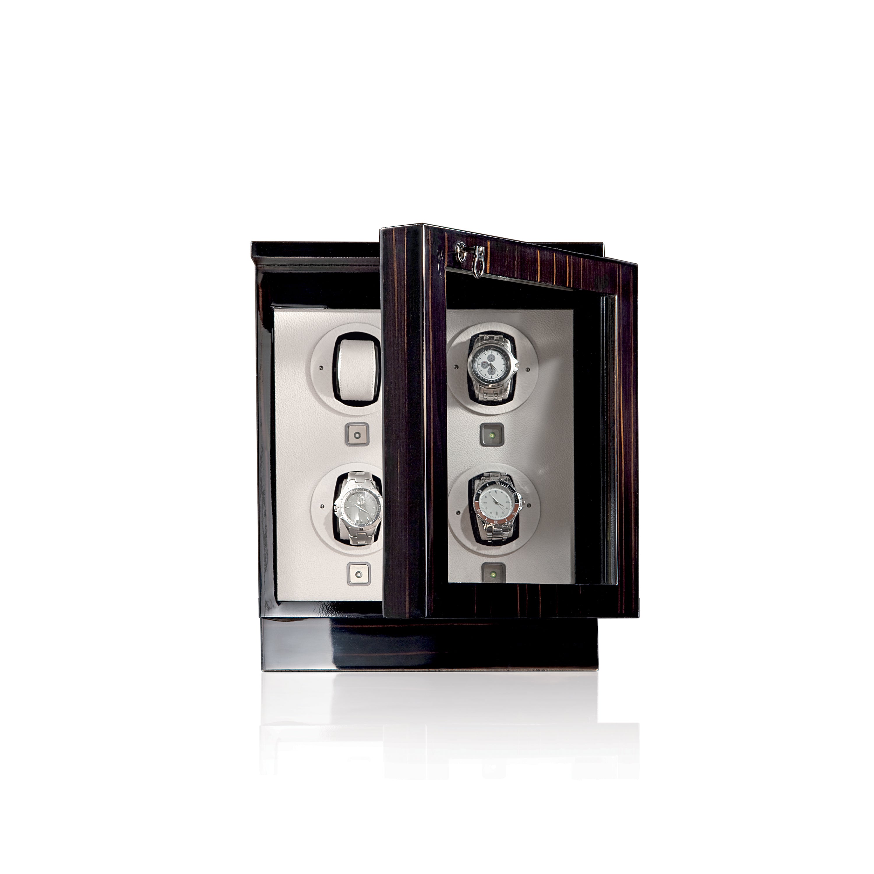 Polished ebony chest with 4 watch winders entirely made in Switzerland, lined in leather, touch switch, glass door. Ruthenium finish brass accessories.
