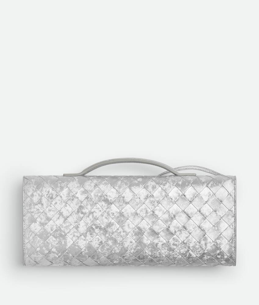 • Intrecciato lamina satin leather top handle clutch with metallic knot closure