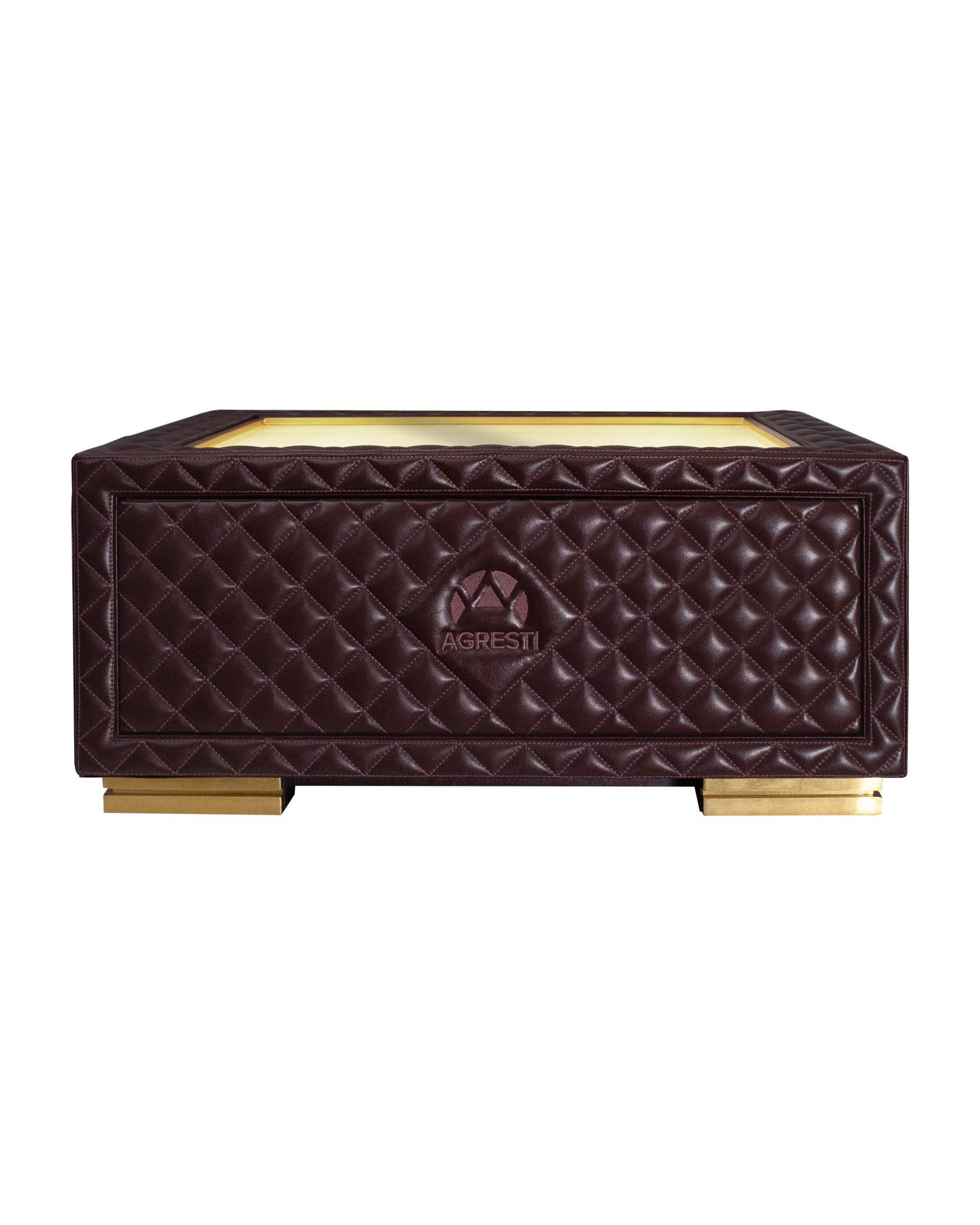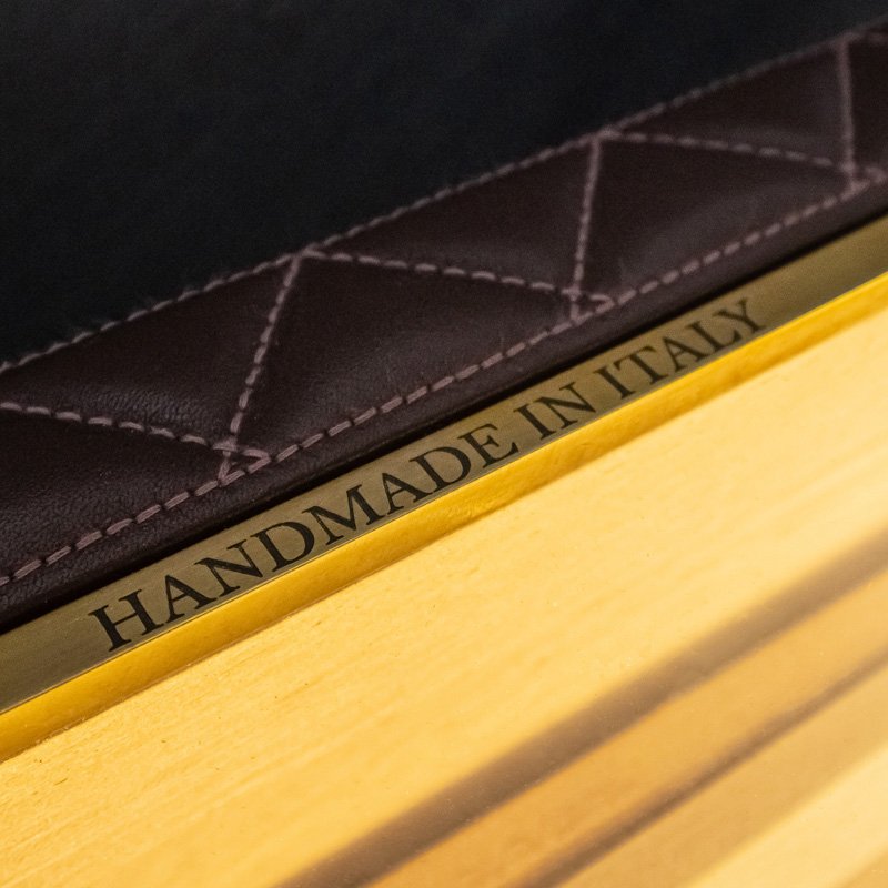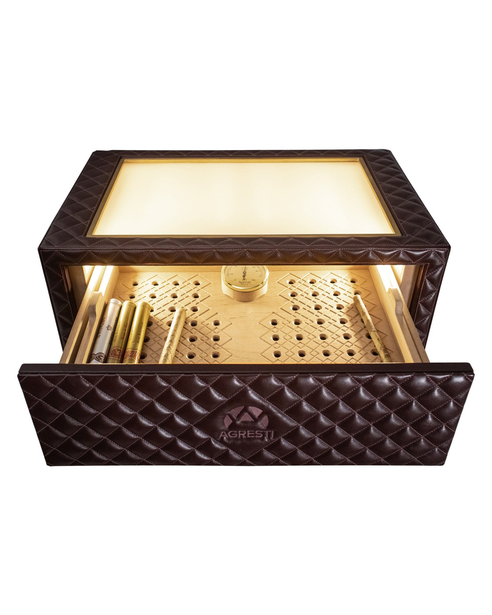 Cigar box covered with padded leather, hand stitched texture. Solid cedar interior. Removable tray engraved with rhomboid texture, humidifier and hygrometer. Opening with keyless card with RFID technology and electrochromic glass above. Brushed brass details.
