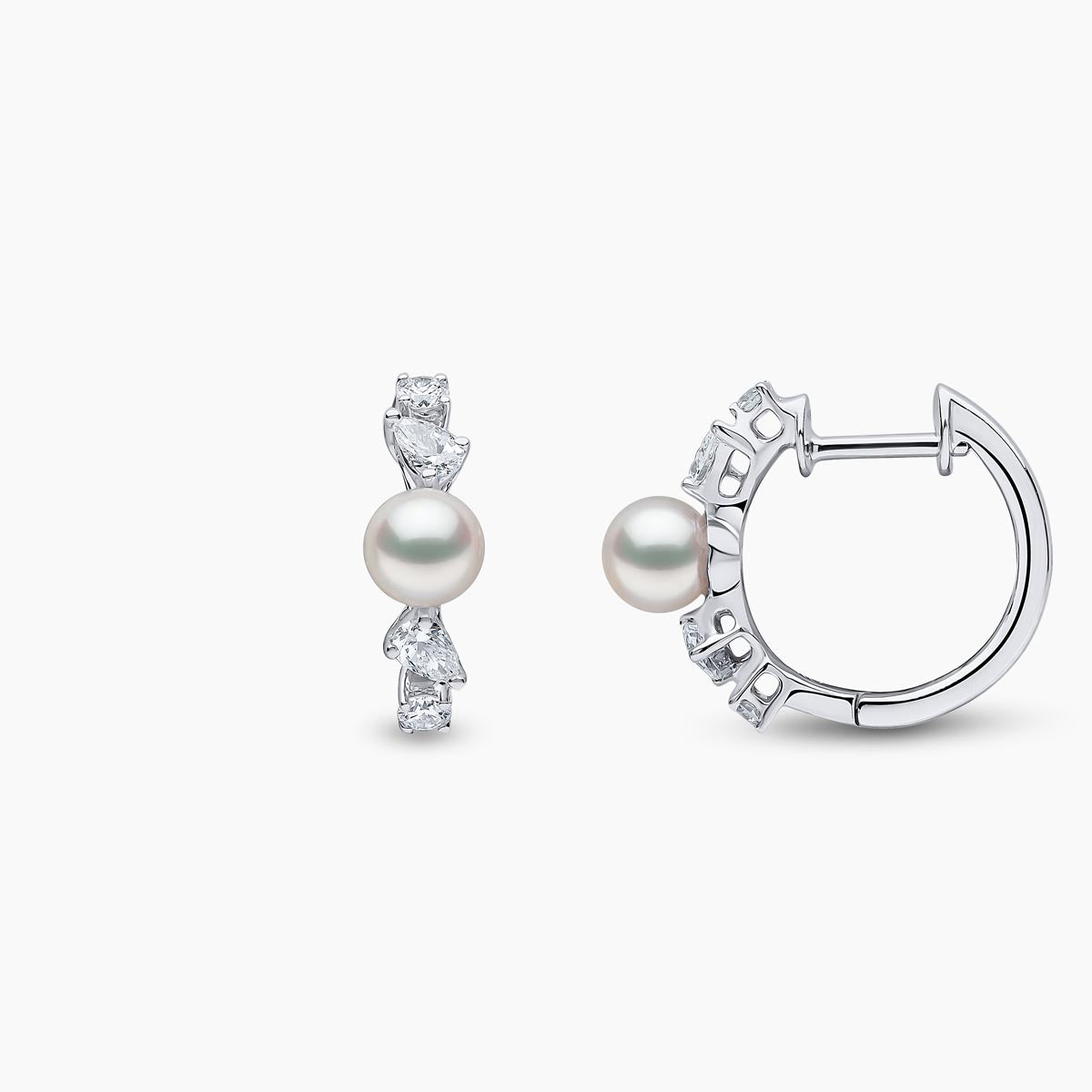Step into the modern flair of Baby Glitz with these exquisite 18K gold huggie-style hoop earrings. Featuring alternating round-cut and pear-cut diamonds, to create a dynamic style. A lustrous Japanese Akoya pearl, effortlessly blending modern charm with timeless grace.