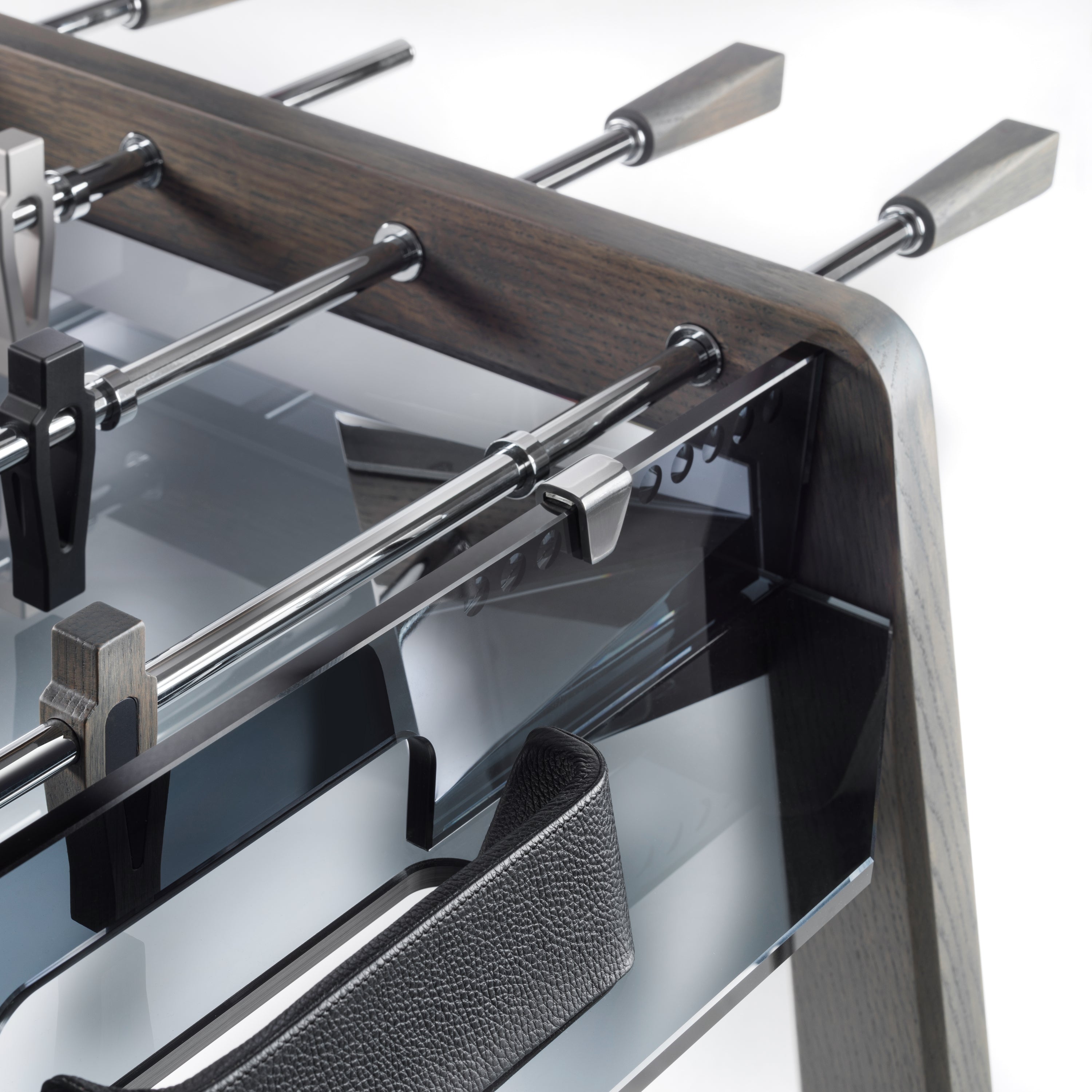 The Derby Wood is a contemporary foosball table characterized by a crystalline smoked glass playing field, supported by a refined solid Dark Oak wood structure. Modern design touches such as geometric handles, sublime metal details, and leather goals strike an elegant balance between contemporaneity and the renowned excellence of Italian craftsmanship