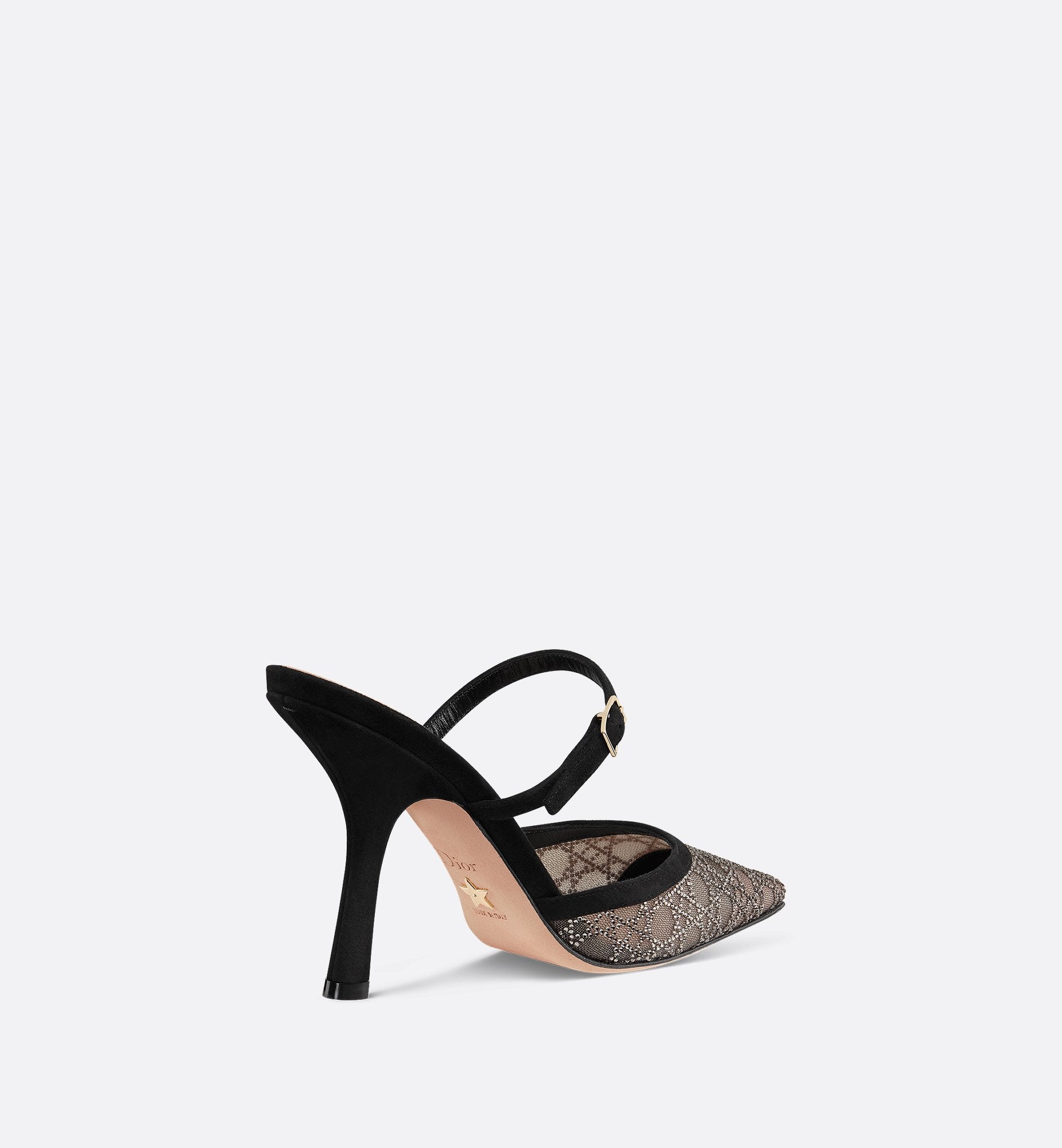 The Dior Capture mule is a delicate creation with modern elegance. Offering a sophisticated element of transparency, the mesh and silver-tone strass style showcasing the Cannage motif is enhanced by black suede goatskin details. An adjustable buckled strap, pointed toe and 10-cm (4-inch) comma heel add the finishing touch to the refined shoe.