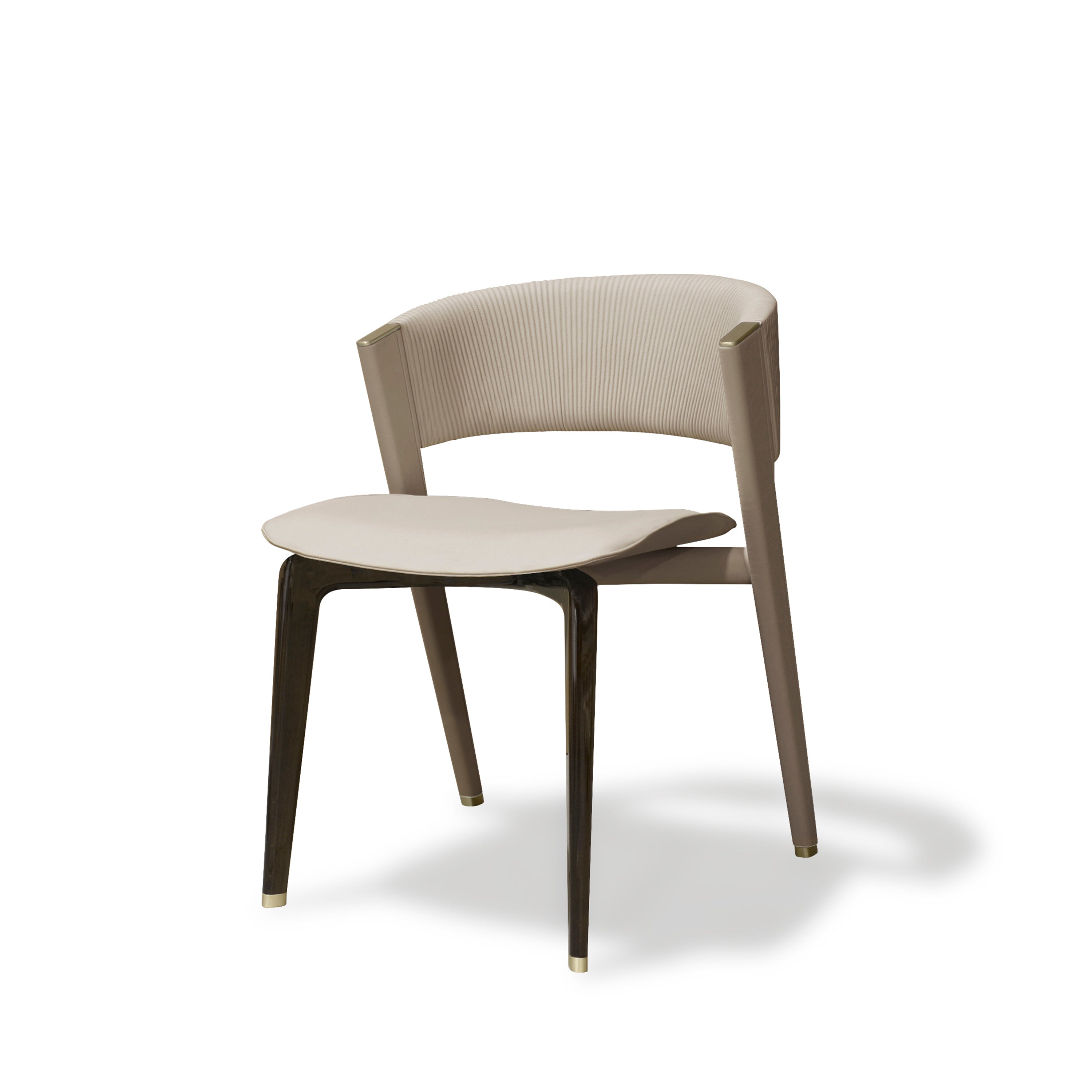 Designed to be matched with Nova table, Lisbona chair is suitable also for other tables placed in different living areas: the look of this item is refined and its proportions have been thought to grant the best comfort. The front legs are realized with maple tree wood lacquered with dark brown colour while the frame and back legs upholstered with leather, present refined brushed metal details on the upper part. The back legs,a bit reclined internally, sustain an enveloping leather back embroidered with “plissè” effect while the seat, that is upholstered too, exalts the shape of this chair showing the cross detail that joins the legs.
