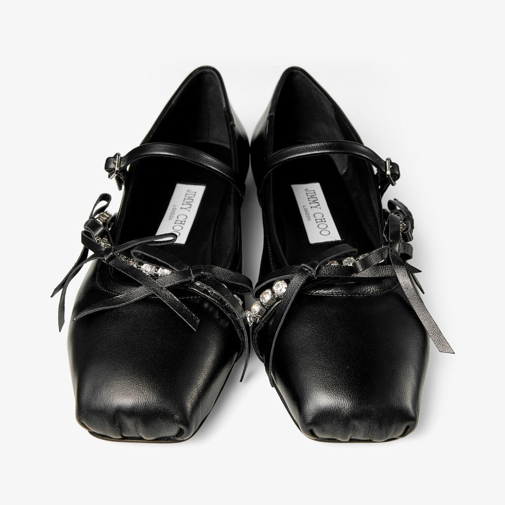 A playful take on the classic ballerina flat, the Loli is presented in glossy Nappa leather and contrasting leather and satin trims. The silhouette is defined by double straps and a squared toe reminiscent of pointe shoe, embellished with crystals accents and satin bows.