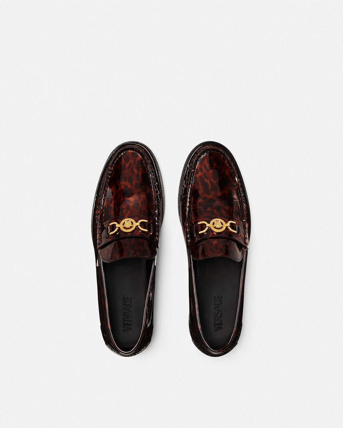 Loafers crafted in patent leather with a tortoiseshell pattern featuring Medusa '95 hardware at the penny straps.