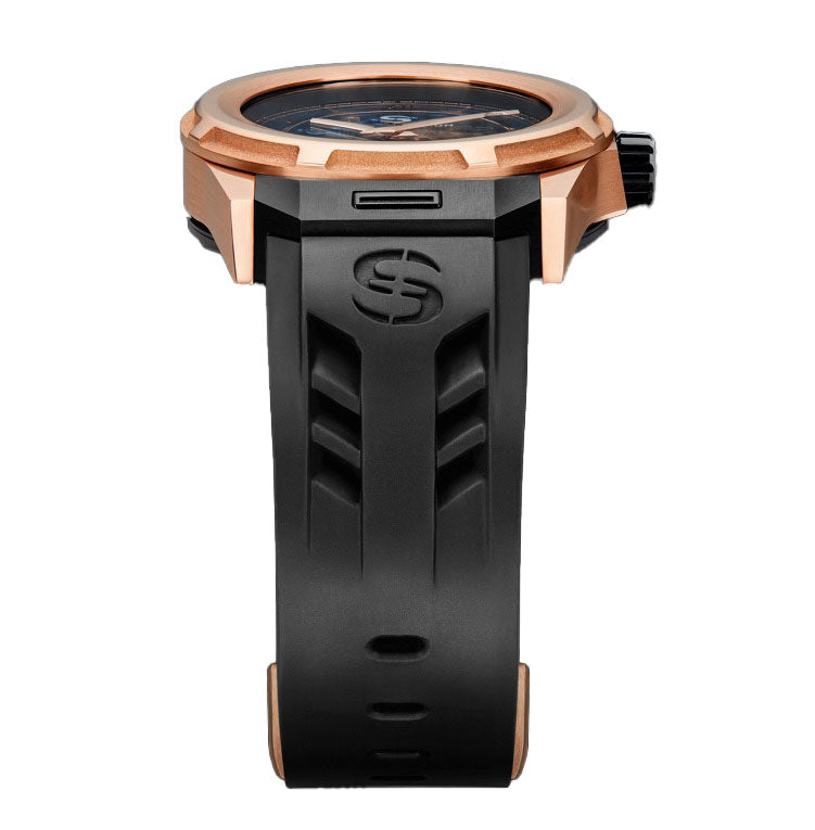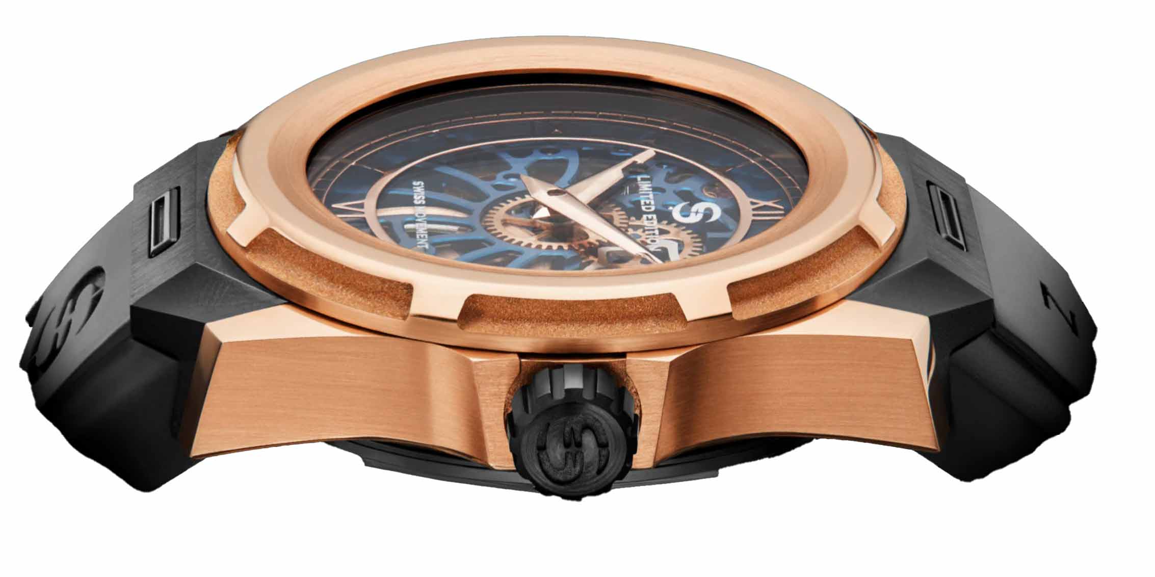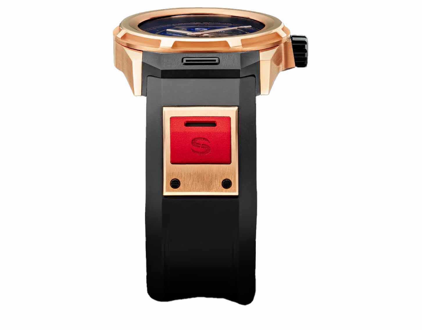 Solid 18K Rose Gold body and bezel cast in a traditional lost wax process with radial brush, polish, sandblast and linear brush finishes applied by master craftsmen. Laser etched PVD billet machined Titanium caseback featuring radial brush finish and sapphire window revealing the intricacies of the movement.