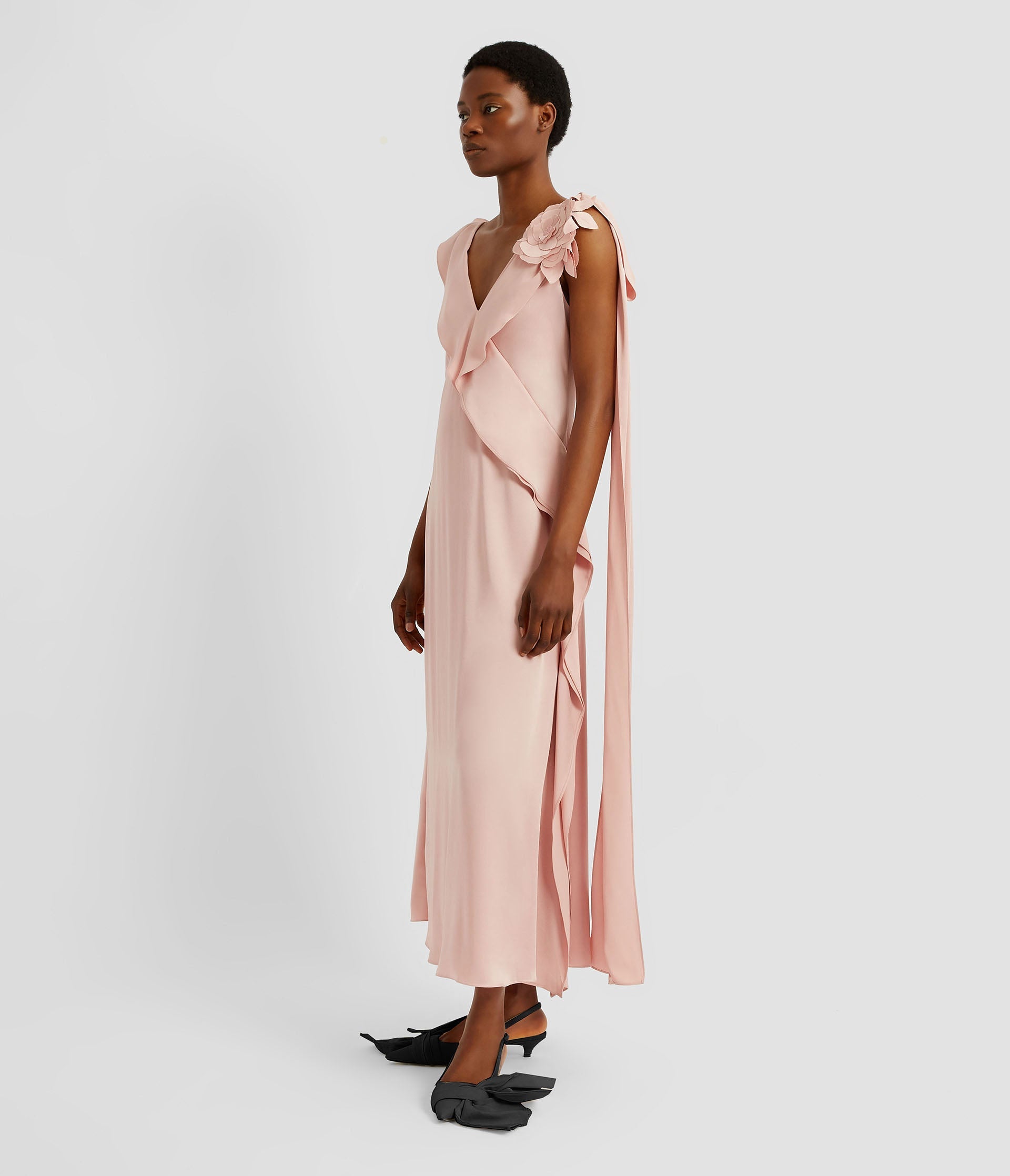 This slipper pink satin slip dress is crafted with a waterfall drape and a tonal 3D flower appliqué.