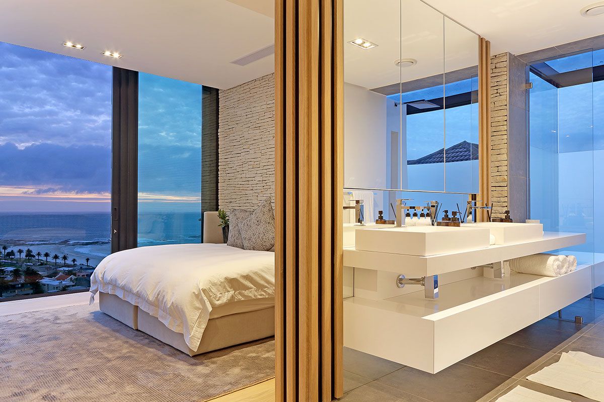 With a mere 50m walk to Camps Bay beach, this luxury villa designed by Stefan Antoni, boasts unobstructed beach and ocean views, a sky room that opens up to a roof-top terrace with further views of the ocean in front and mountain behind. A dream location to spend a relaxing holiday.