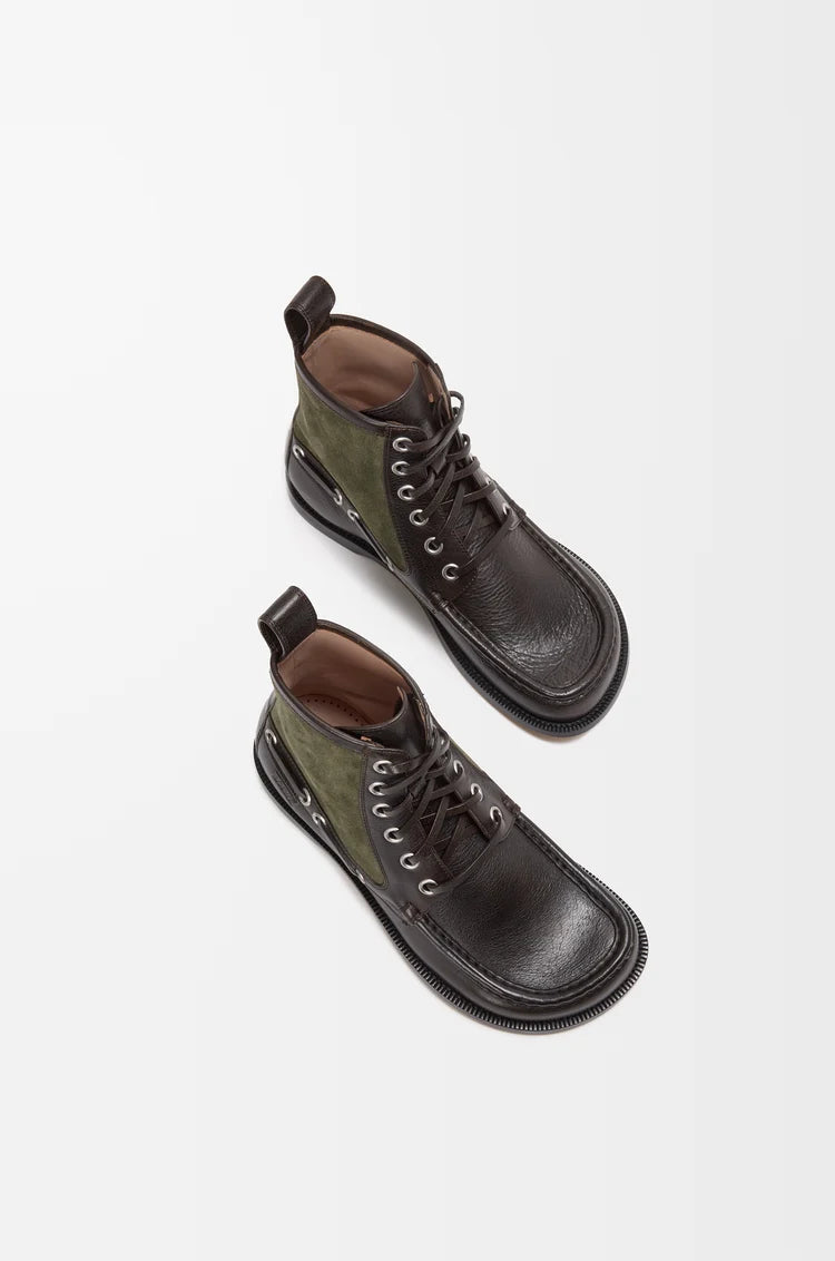 Bootie in calfskin with contrast suede inserts inspired by the Campo boat shoe with the signature round asymmetrical toe shape and a hand-sewn construction with a supple leather lining.