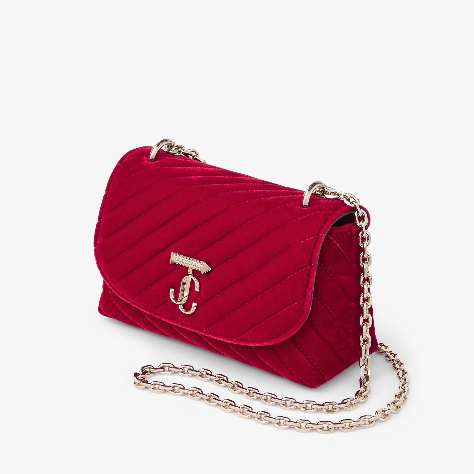 Timeless yet contemporary, the Curve Crossbody Bag is crafted in rich quilted velvet with striped quilting and a softly curved silhouette. Layered flap closures bring a sense of refined structure, while a JC monogram with a crystal-embellished bar adds signature polish. Finished with a versatile chain shoulder strap, it’s an elevated piece designed to complement every wardrobe.