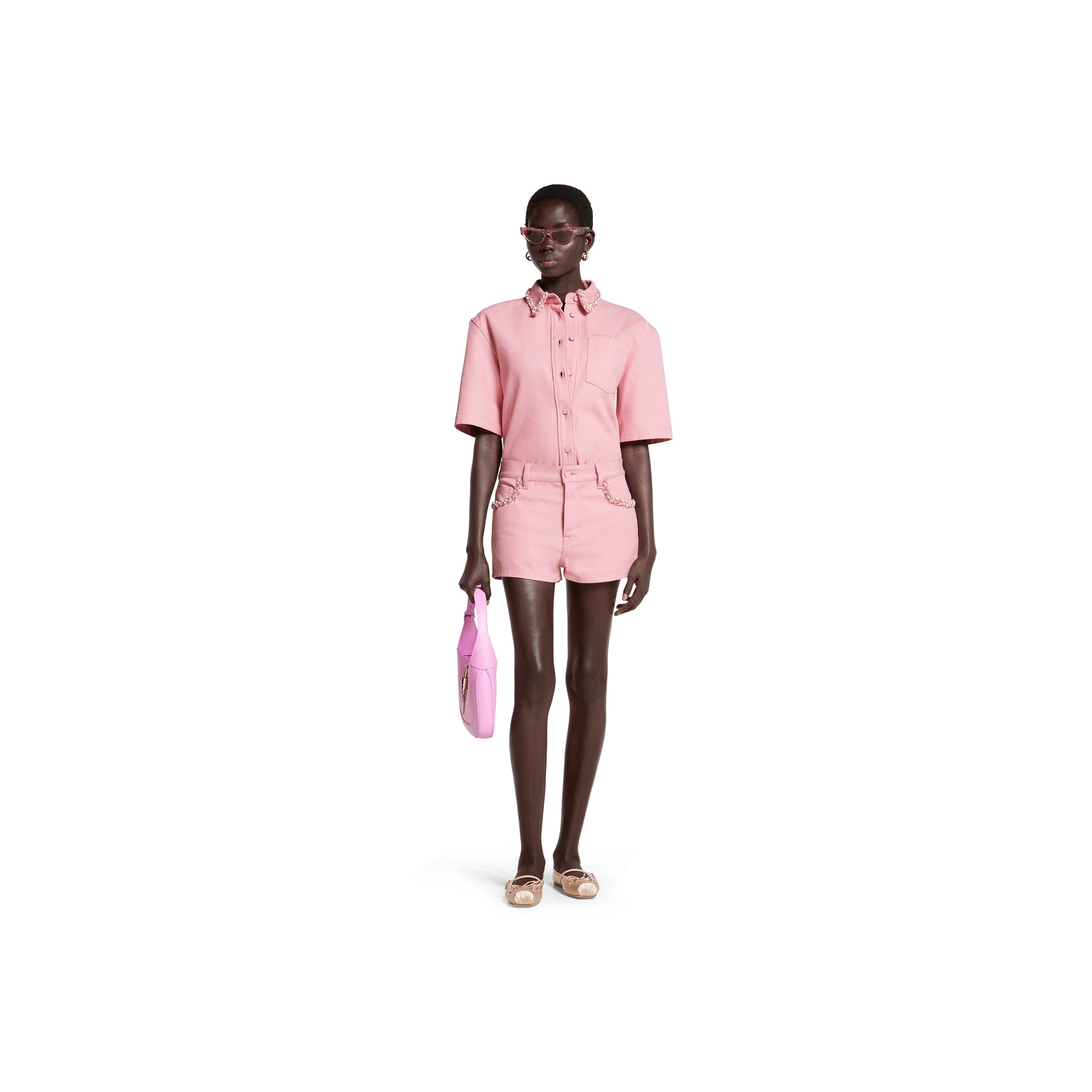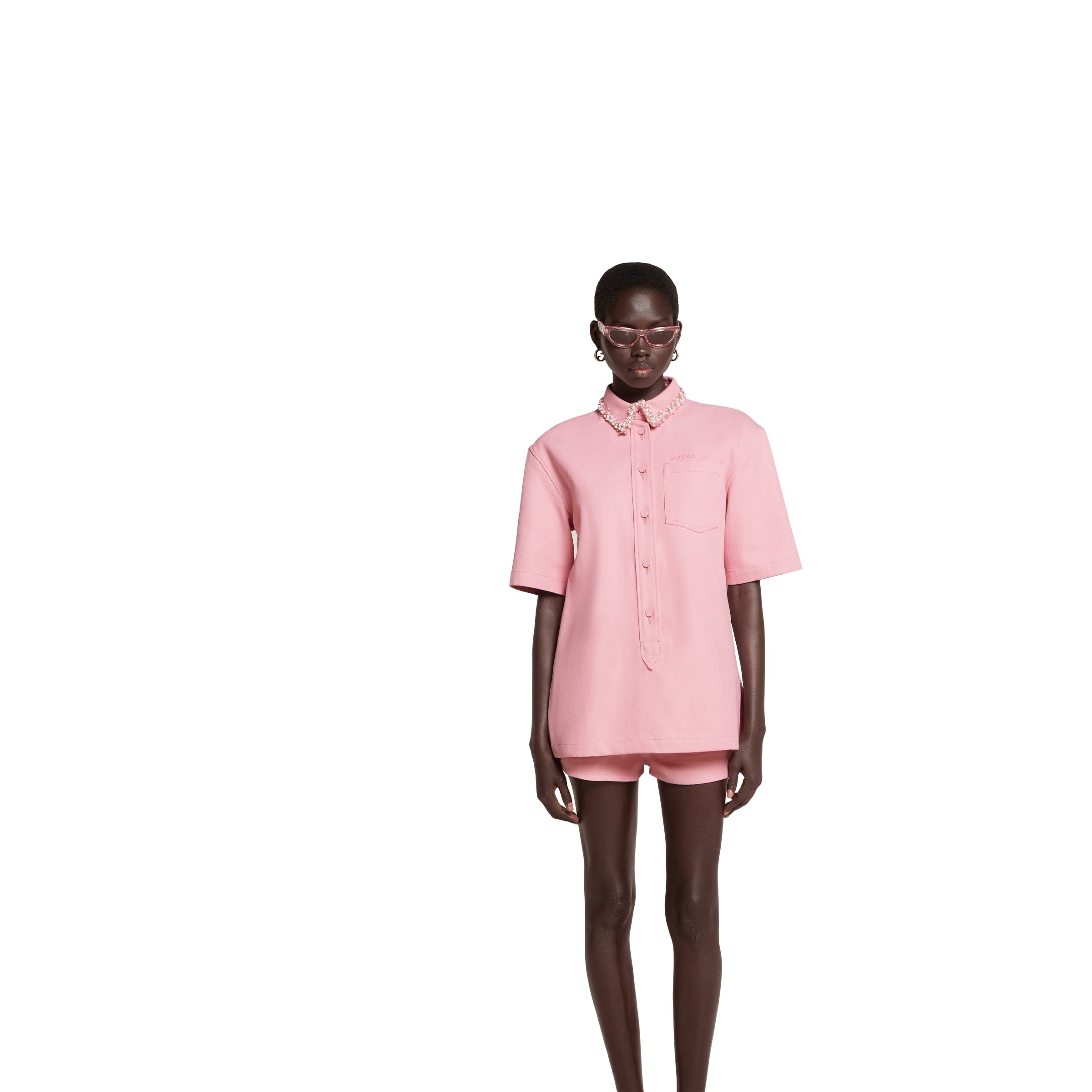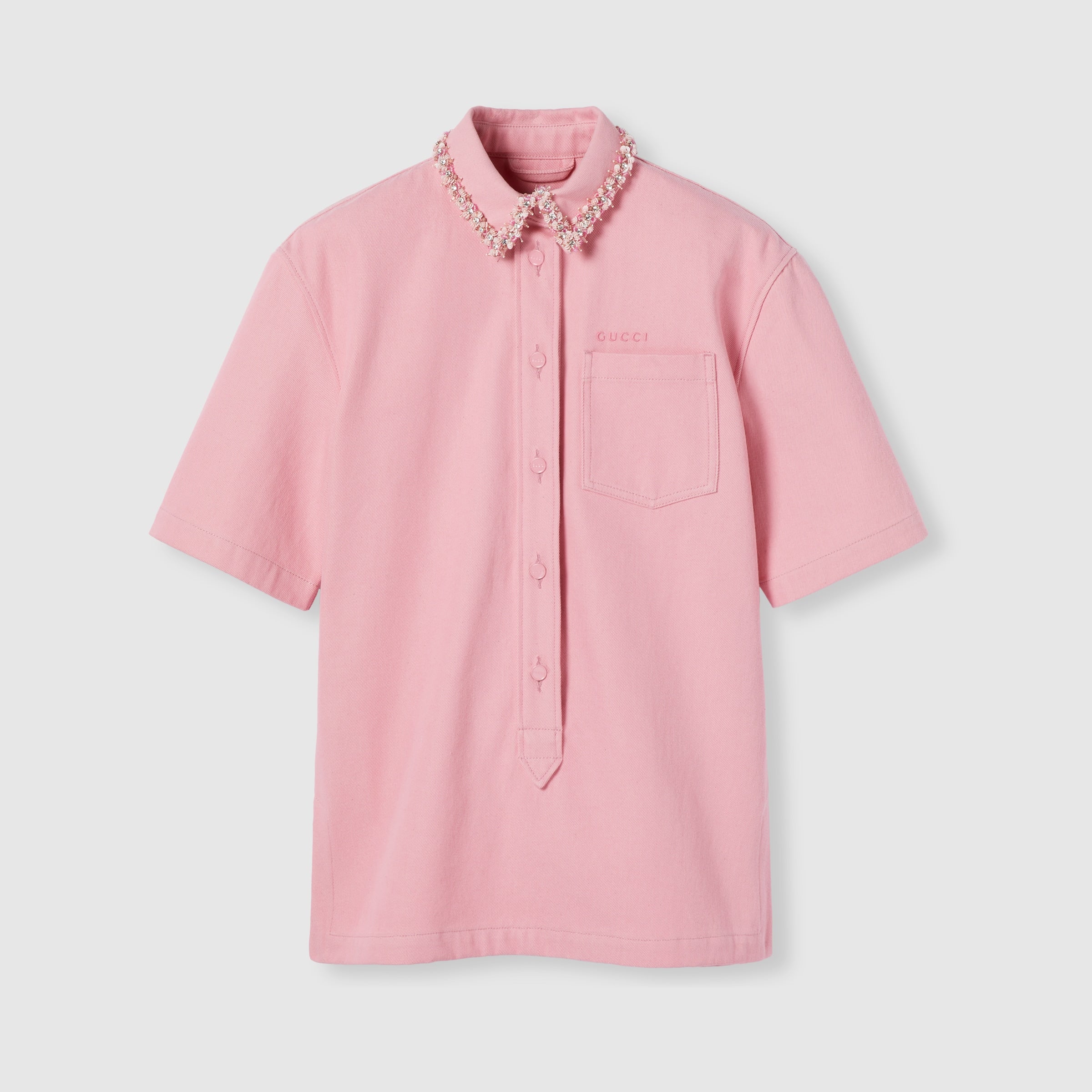 The House's heritage motifs are presented on a backdrop of sophisticated textures, from off-duty denim to lightweight canvas and refined suede, for the Pre-Fall 2025 collection. A polo-style denim shirt is elevated with an embroidered collar and enamel Gucci buttons.