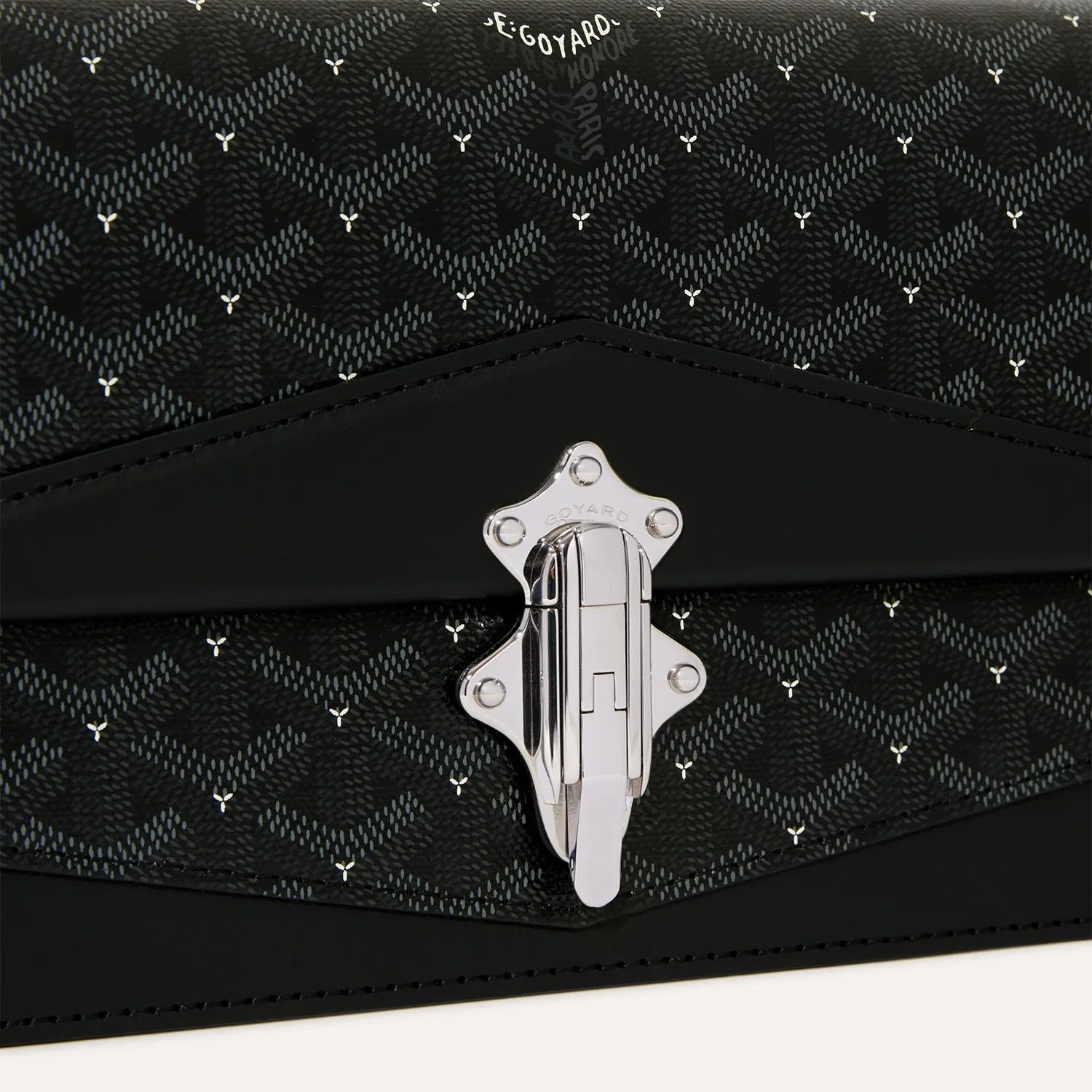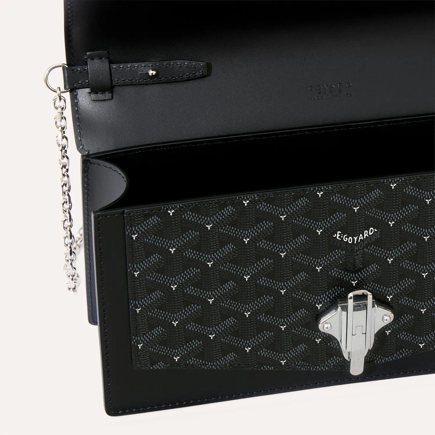 The Duchesse Marie-Caroline bag dresses up in a new exclusive deep-dark "Capitonnage" Goyardine canvas, subtly contrasted with smaller white chevrons, in a nod to the quilting of our historic trunks. At once elegant and practical, it can be worn around the shoulder, cross-body style or carried by hand as an evening clutch thanks to its removable chain strap.