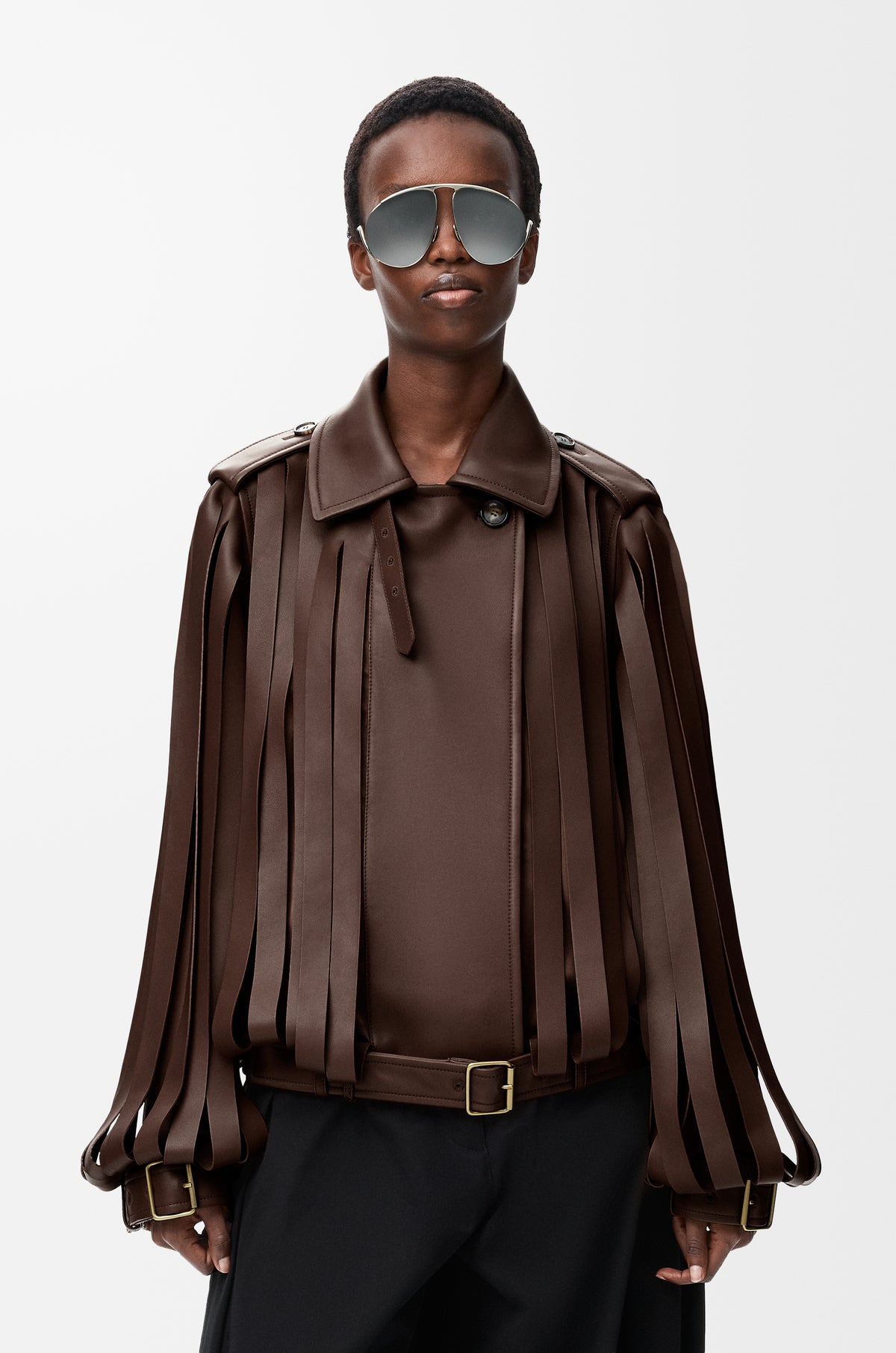 Jacket in medium-weight mellow nappa lambskin featuring a double-breasted construction and a layered design with leather strips over tonal silk lining.