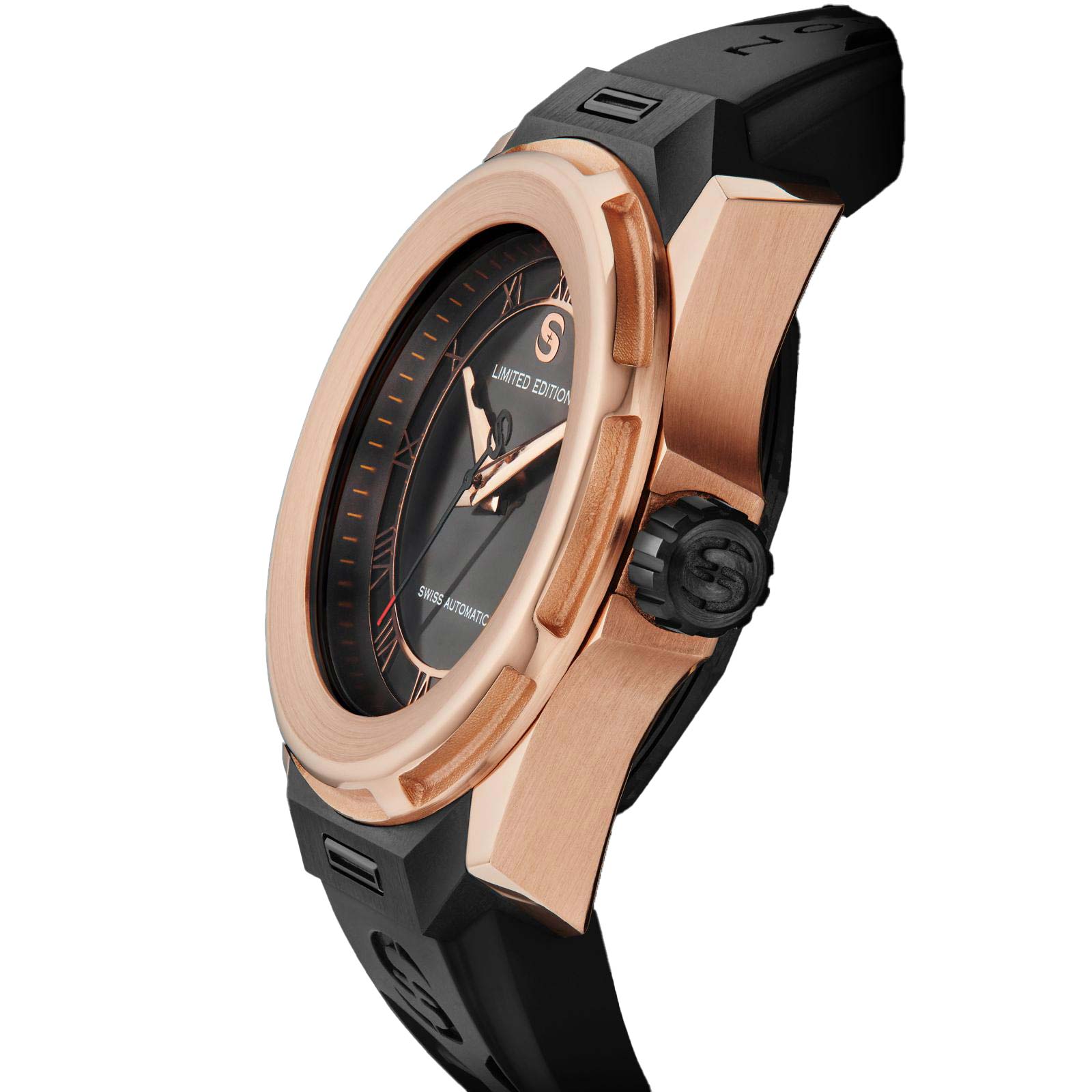 Solid 18K Rose Gold body and bezel cast in a traditional lost wax process with radial brush, polish, sandblast and linear brush finishes applied by master craftsmen. Laser etched PVD billet machined Titanium caseback featuring Senturion S logo and radial brush finish.