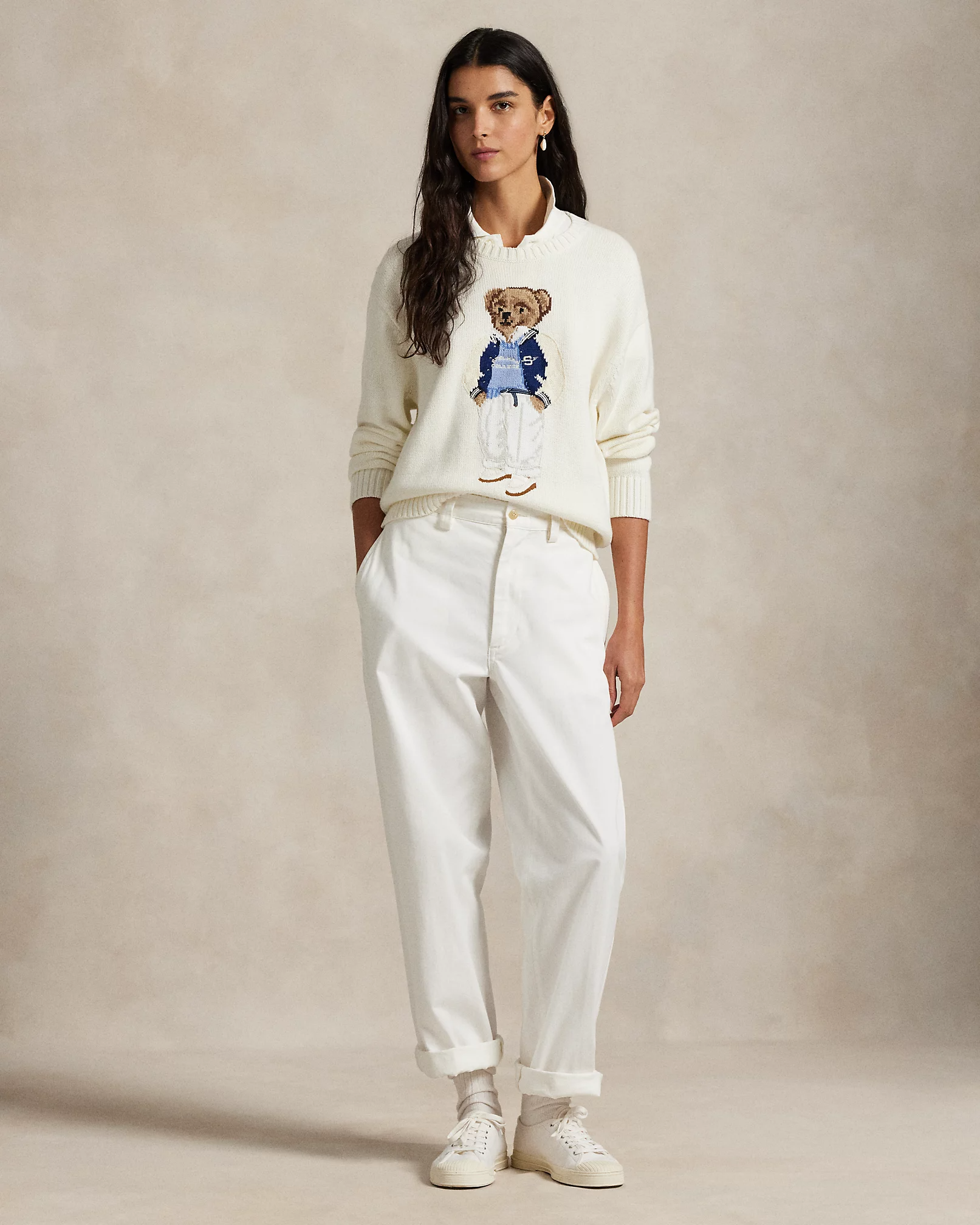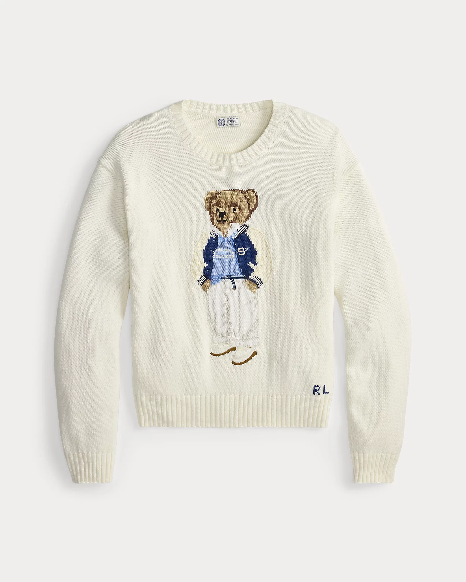 In this sophomore collaboration, Ralph Lauren is proud to partner with Spelman College – one of America's pre-eminent historically Black colleges and universities. Inspired by the rich heritage and esteemed traditions of Spelman College, this cotton crewneck jumper features the Polo Bear wearing apparel that nods to the storied institution, including a satin jacket modelled after Ralph Lauren's inaugural collection with Spelman College.