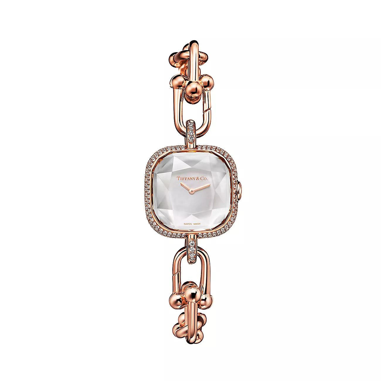 Tiffany HardWear watches are as bold as they are refined. Handcrafted in Switzerland, each watch features the iconic gauge links and brilliant diamonds. This 18k rose gold watch features pavé diamonds and a white mother-of-pearl dial. A hidden clasp creates a streamlined design, while a faceted sapphire-glass crystal evokes the unique shape of the legendary Tiffany Diamond. It makes a beautiful statement worn on its own or layered with Tiffany HardWear bracelets.