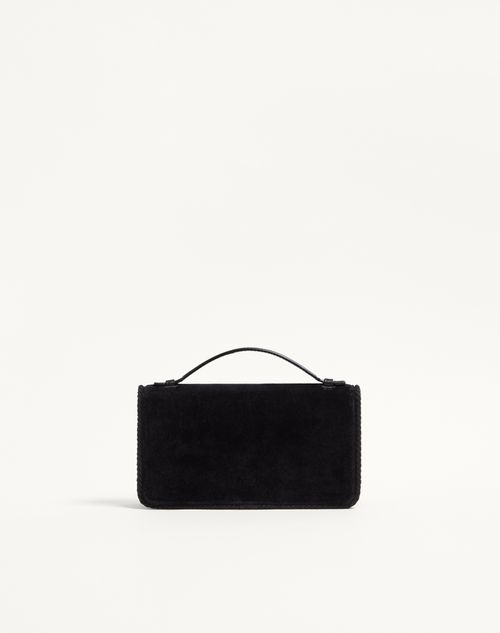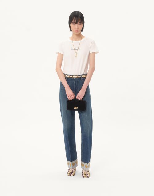 Valentino Garavani VLogo Signature velvet chain wallet with jewel logo. The accessory can be handheld or may be worn crossbody or over the shoulder thanks to the handle and the detachable chain. Antique brass finish logo and hardware - Jewel logo adorned with synthetic pearls and Swarovski® crystals - Magnetic button closure - Leather handle - Moiré lining. Interior: wall pocket with zip and two card slots - Removable chain. Shoulder strap drop length: 55 cm / 21.7 in. - Dimensions: W19xH11xD4 cm / W7.5xH4.3xD1.6 in. - Made in Italy