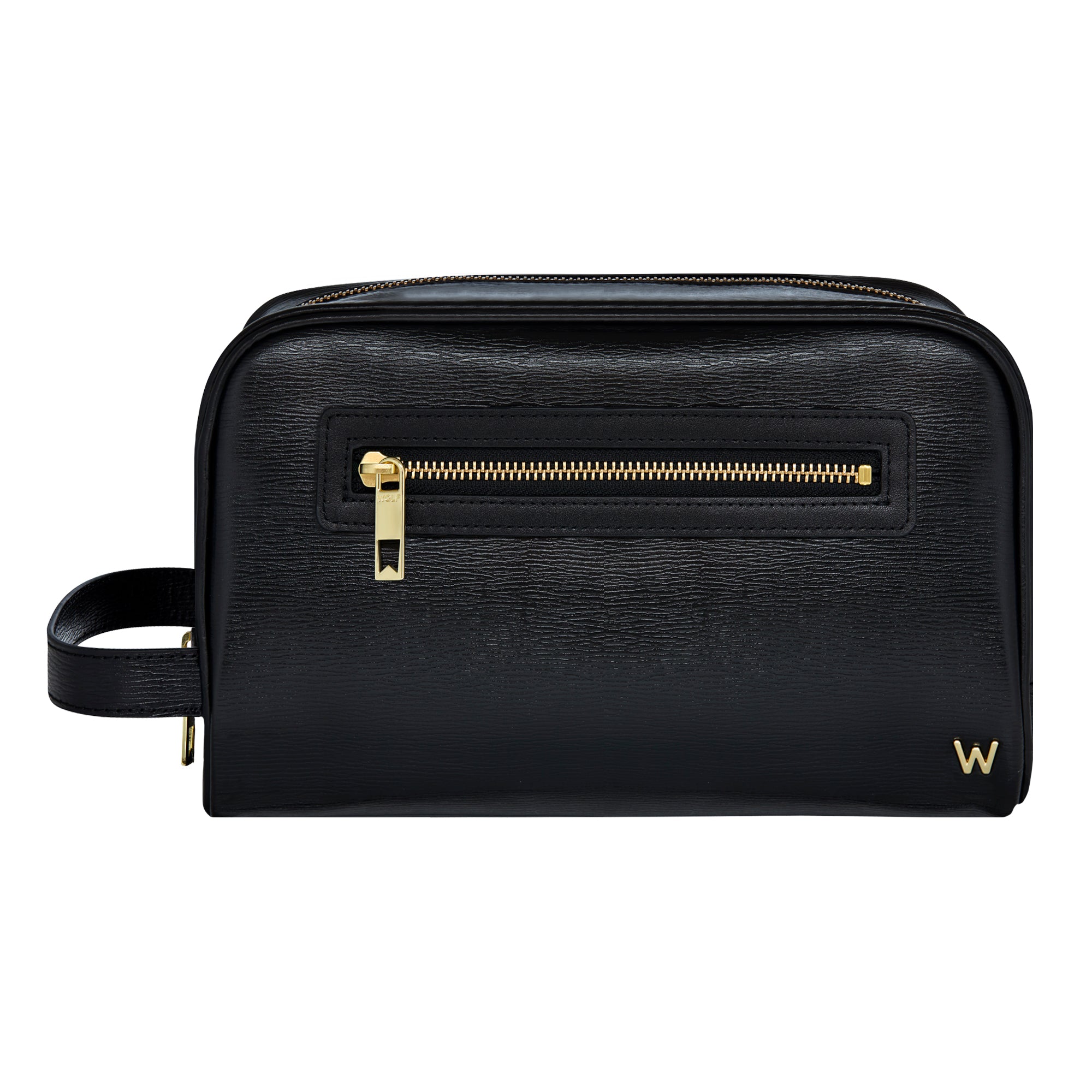 The W Collection is a luxurious, sleek, and sophisticated leather accessories collection. Crafted with embossed grain and sustainably sourced leather, our gold W logo and deep green lining. Store your toiletries in style with the W washbag. Featuring a sophisticated design, this spacious wash bag comes with an exterior zipper pocket, interior sleeve pocket and a carry handle. This timeless washbag is the perfect accessory to take with you on all your future travels.