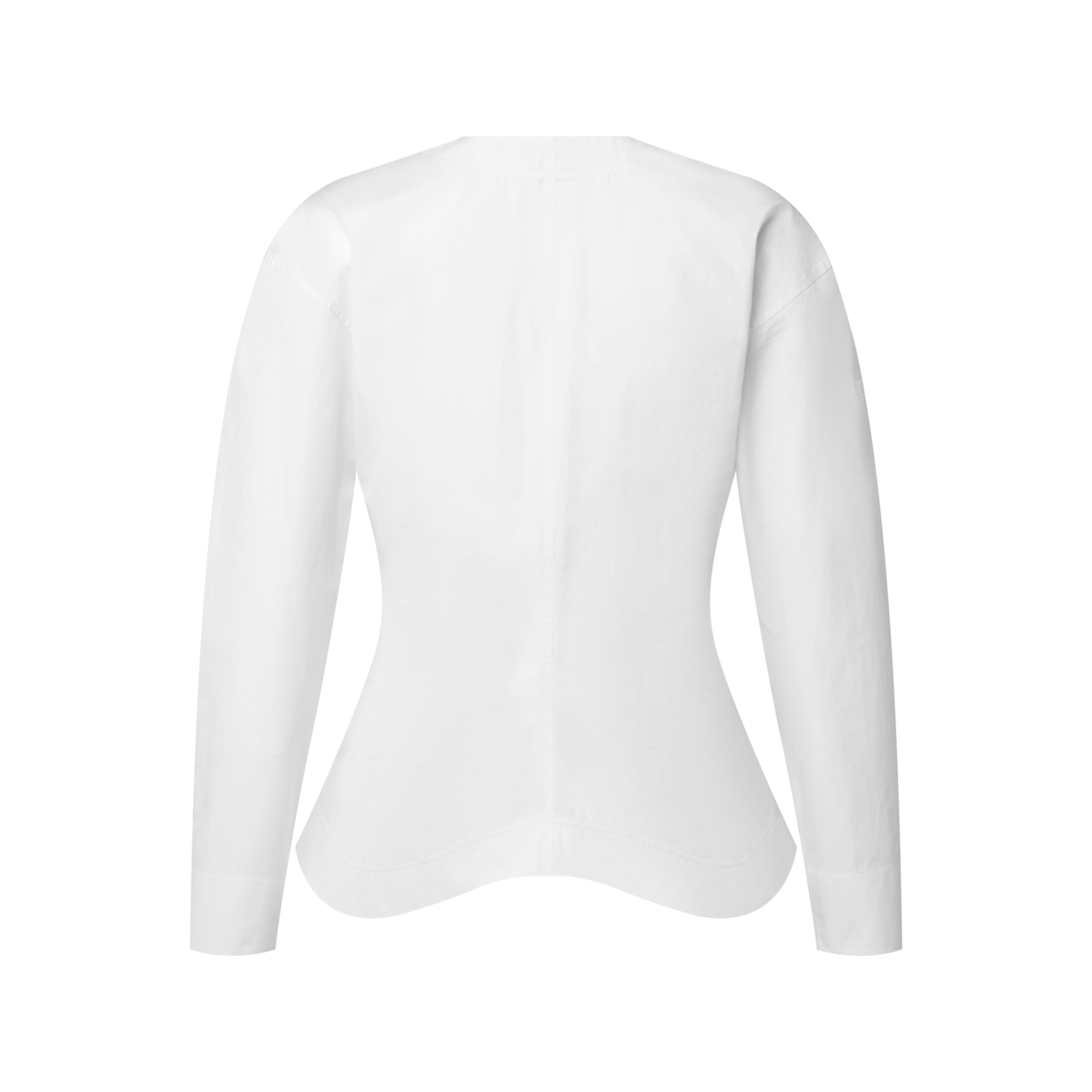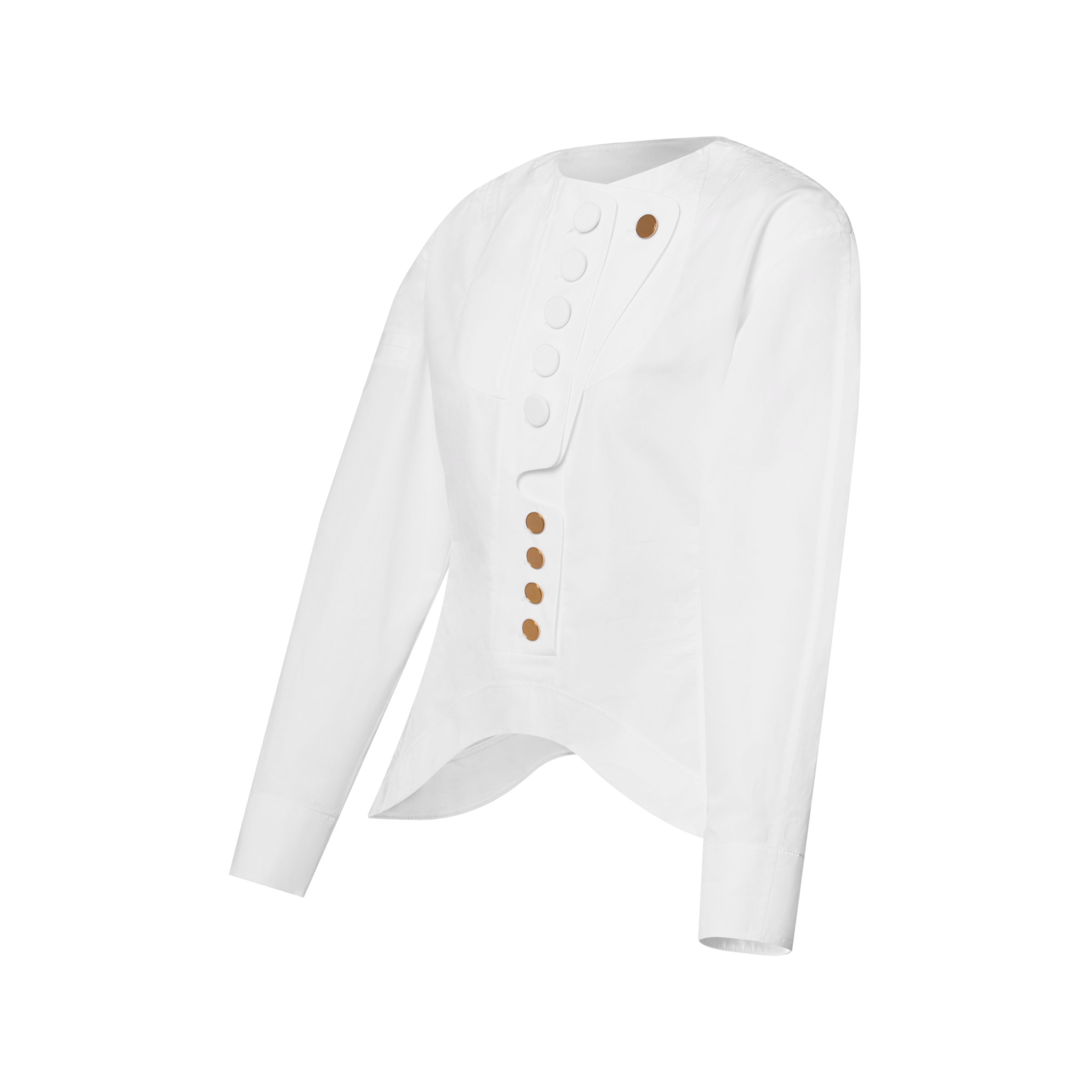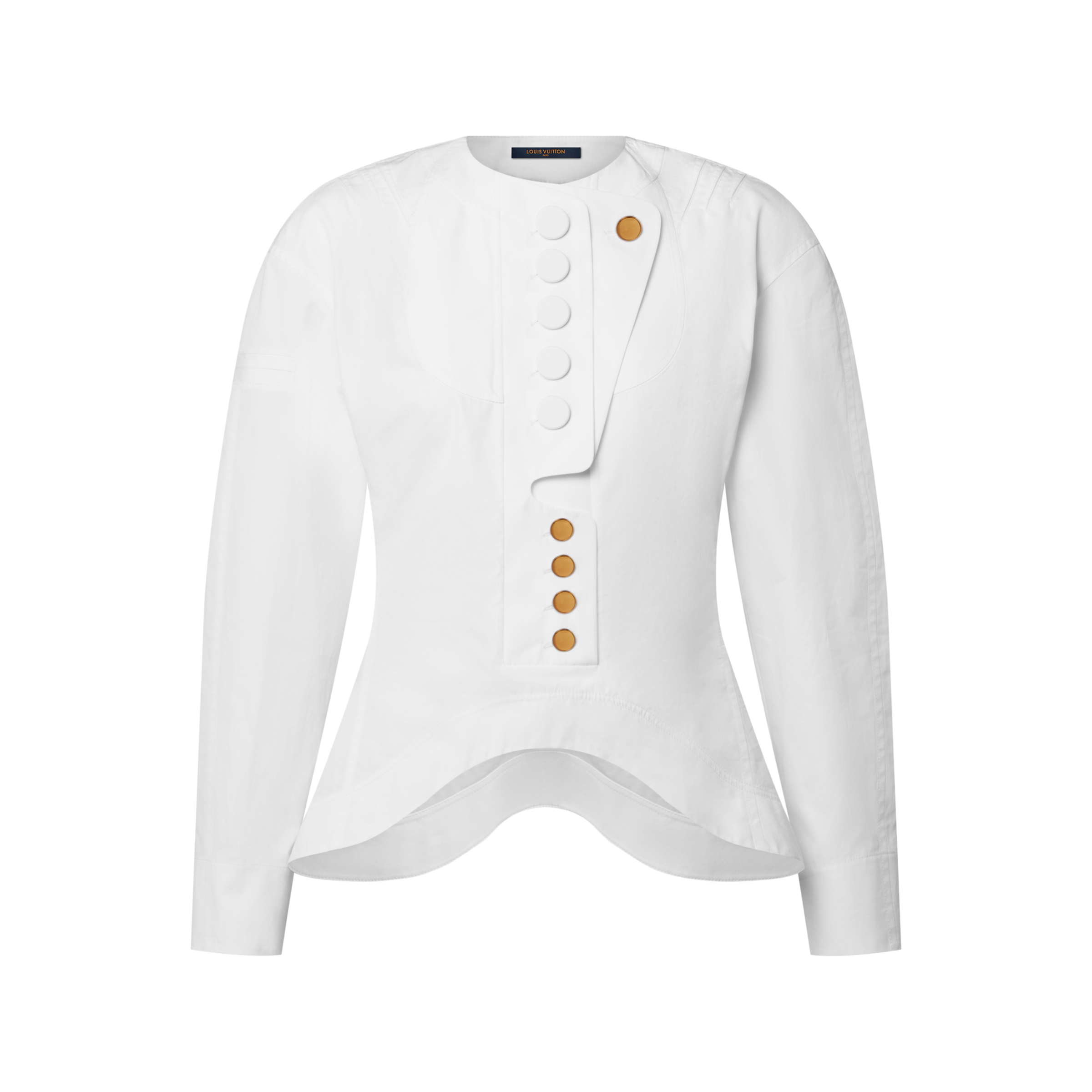 Directional detailing from the Nautical Collection elevates this blouse with a striking, modern look. It is tailored from lightweight cotton poplin with rounded shoulders, a tapered waistline and a graphic curved hem. The chest is embellished with a layered button bib that is fastened with a combination of covered and metallic buttons for a polished finishing touch.
