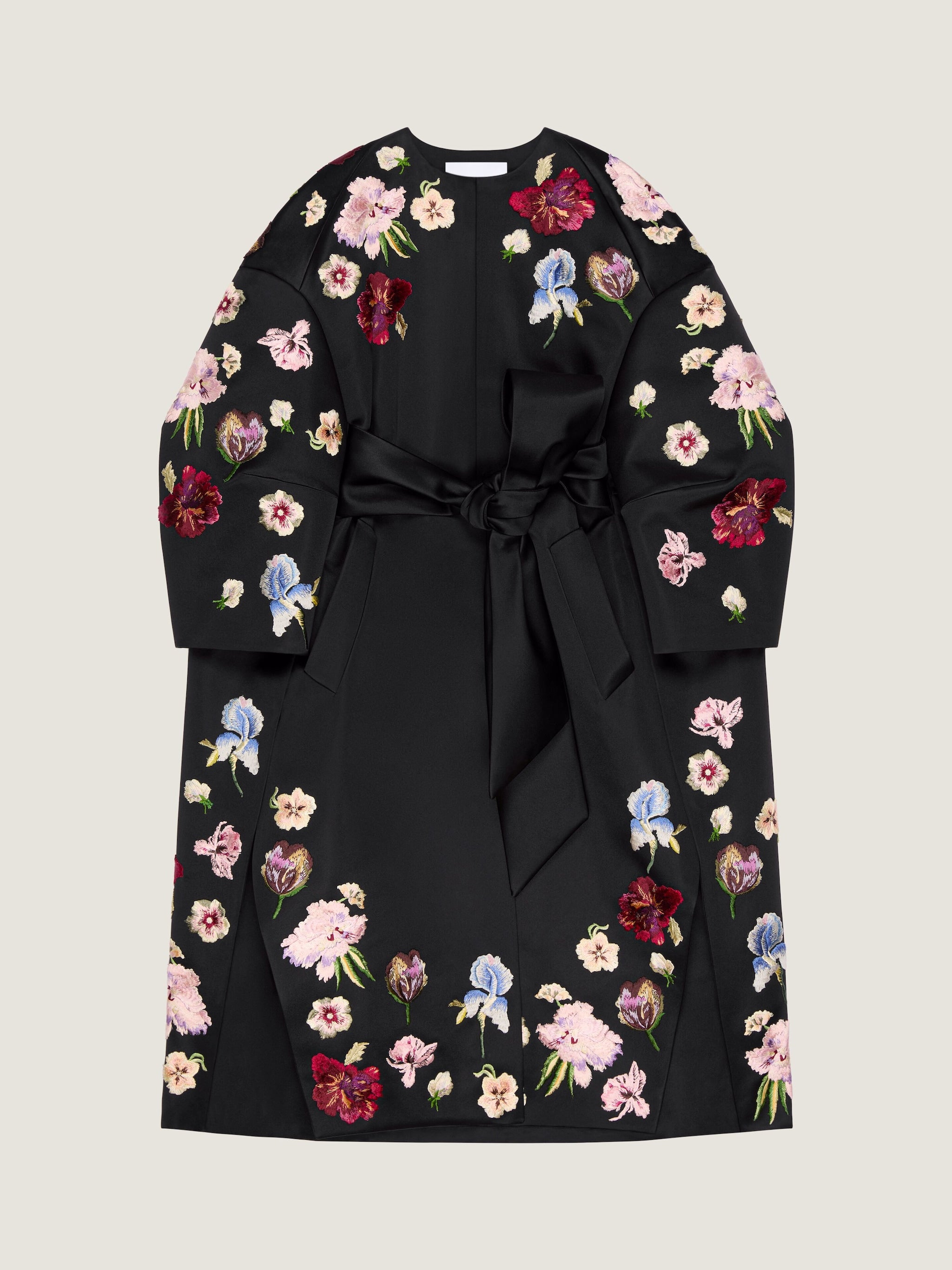 Silhouettes are inspired by flowers in bloom, with poplin shirts peeling from the shoulders like petals and dresses unravelling through ruffled hems. Prints, silks and viscose feature jacquard and silk-screen floral motifs, while satin-stitch embroidery references the archives of Hubert de Givenchy.