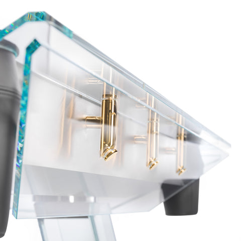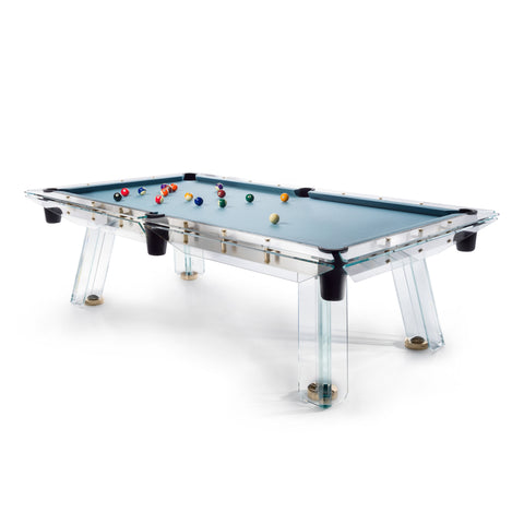 A unique glass billiard table that showcases a design with the highest expression of technological sophistication and craftsmanship.