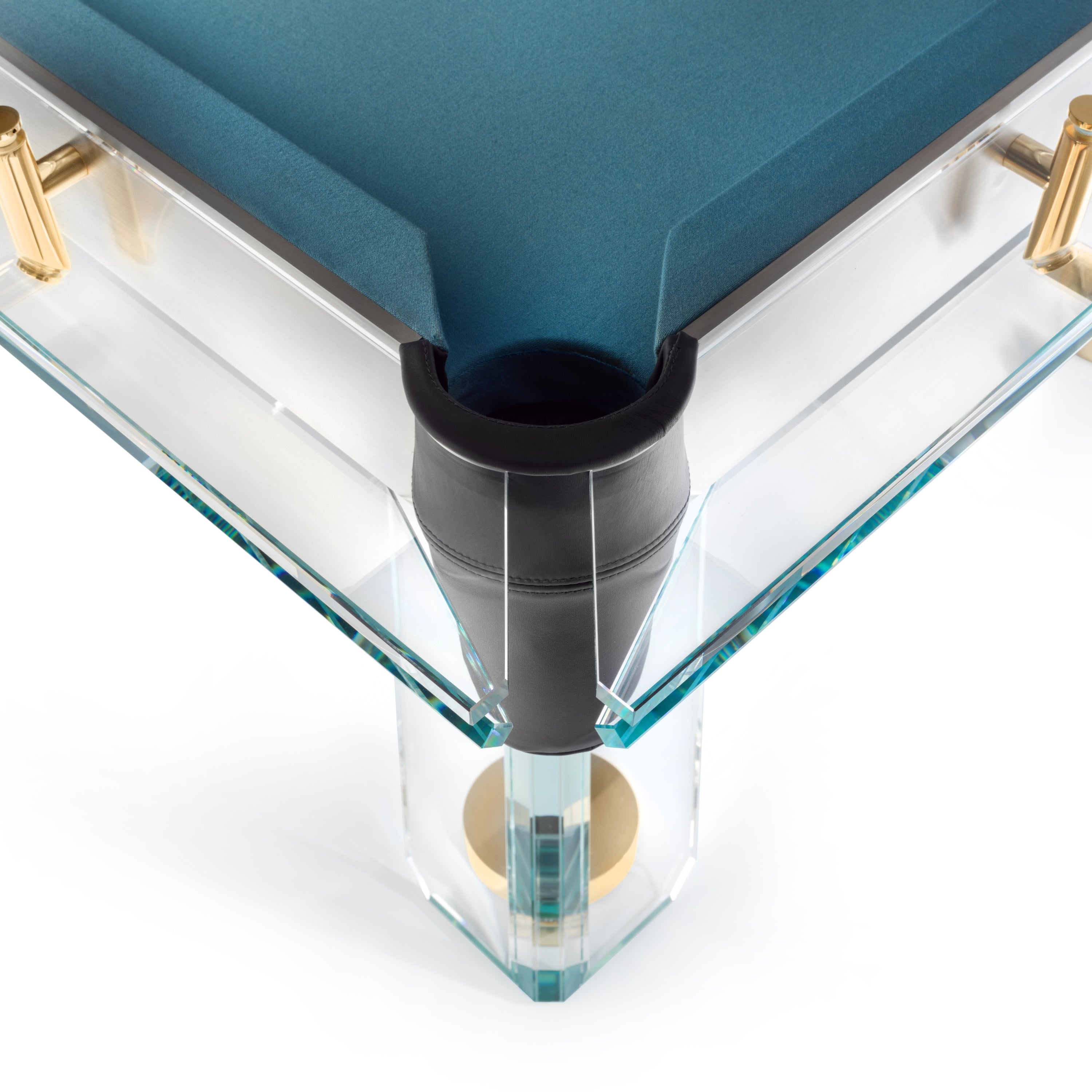 The Filotto Gold is a professional 8ft pro billiard table with a modern low-iron glass frame and a 3-piece slate playing field covered with Simonis cloth. This luxury game table features 24k gold-plated components and handcrafted leather pockets.
