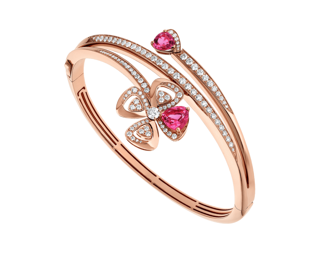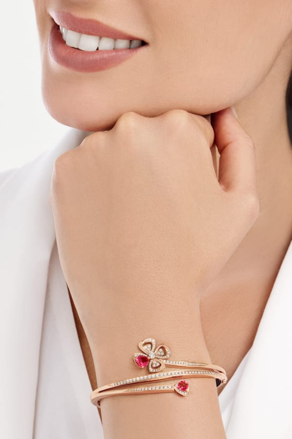 Blooming with its gem-set corolla, the Fiorever 18 kt rose gold bracelet draws inspiration from the alluring four-petal flower cherished by the Romans as a symbol of happiness and joy. Embellished with the timeless elegance of precious diamonds, the floral motif is animated by Bvlgari's signature touch of colour, with two rubellite petals creating a beautiful interplay of volumes, shapes and reflections.