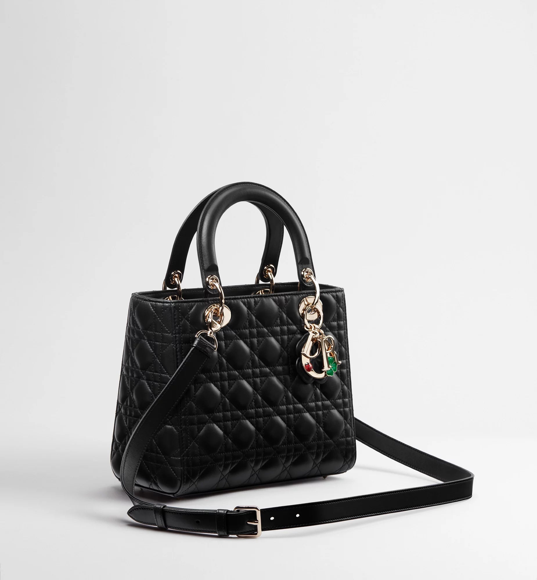 Front D.I.O.R. charms with clover and ladybug details and leather Dior Clover charm