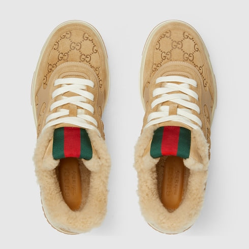 The Re-Web sees Gucci’s heritage stripes as a bold statement detail on a contemporary silhouette. Defined by signature details, this pair of sneakers is crafted from GG suede and completed by a merino wool lining.