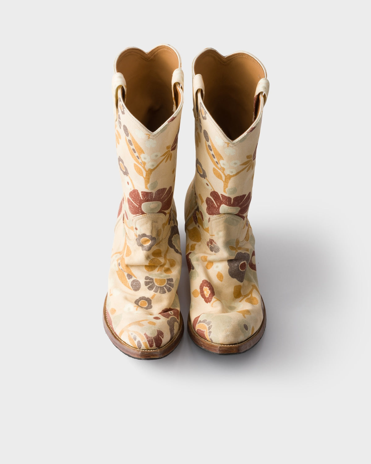 An archive silhouette inspires the design of these texan boots made of fabric and animated with a lively floral print. Unusual combinations and strong contrasts define this bold footwear, characterized by an exaggerated pointy toe and a vintage effect that adds depth and uniqueness to the boot, an expression of authentic, instinctive style.