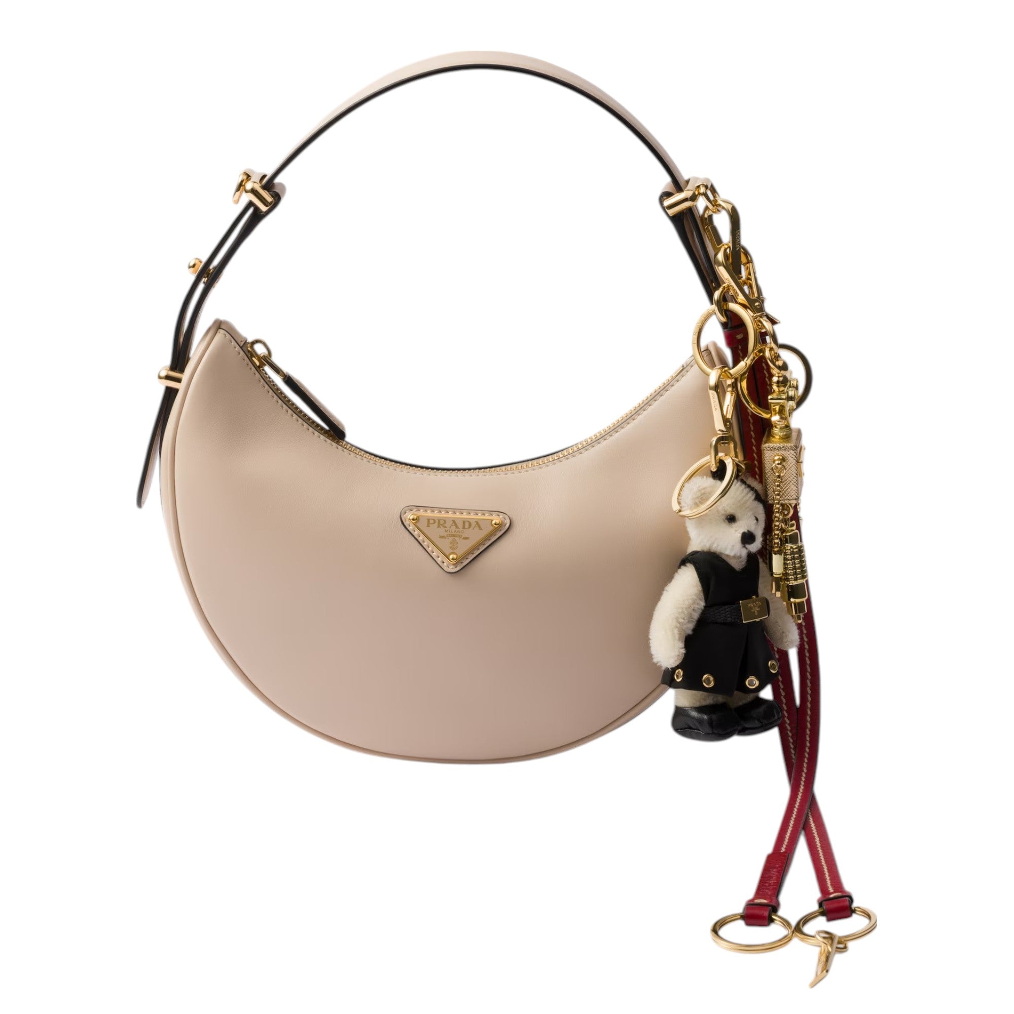 This plush charm, a playful accessory for your bag, becomes the symbol of contemporary style and recalls Prada from the 1990s.