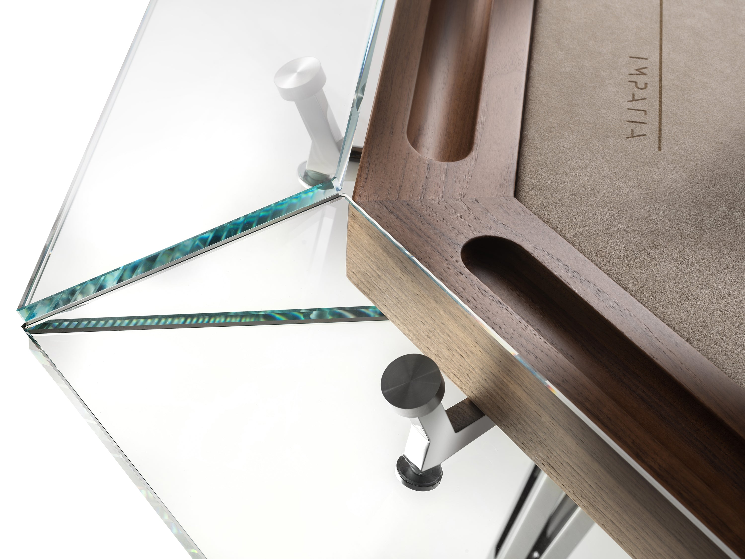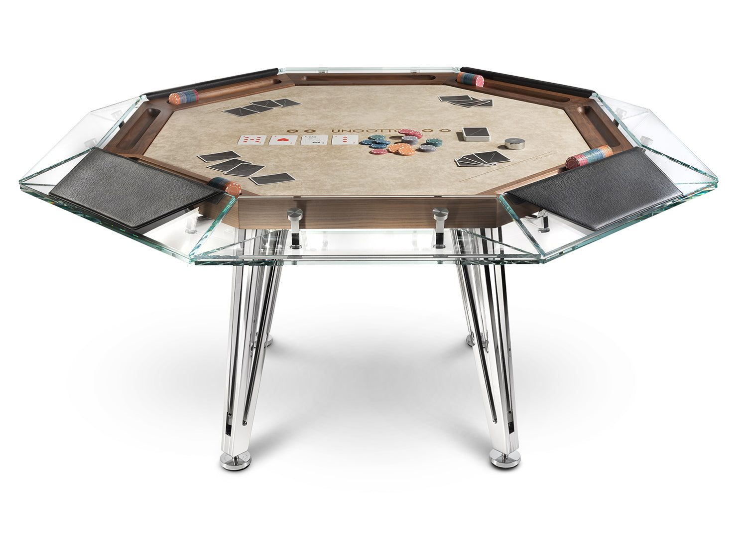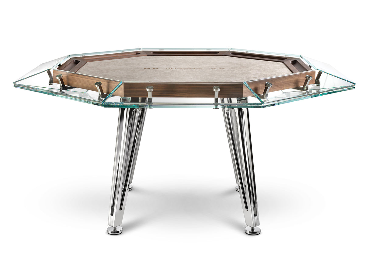 Unootto reinterprets the traditional professional poker table, making the A-game stylish and sophisticated. The modern octagonal game table consists of a glass frame that supports the playing surface in Alcantara. The chrome finish metal legs make this jewel of an Italian design even more brilliant.