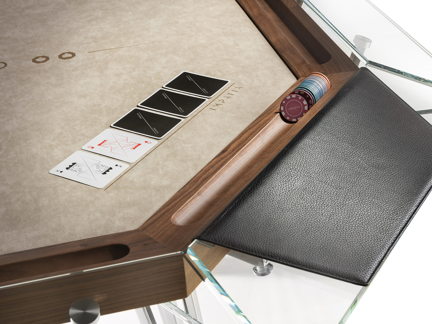 The Unootto Wood features a unique low-iron glass frame supported by an inner solid wood chip holder frame, finished with an Alcantara playing surface and removable leather armrests. The table features black nickel metal legs and components, which adds an extra modern touch.