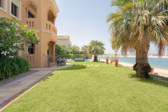 This luxury villa has a pristine landscaped garden with its very own pool, embellished with the beauty of bougainvillaea and the Azure of the Arabian Gulf with views of The Atlantis. The lounge contains two large sofas and accompanying armchairs, wrapped in luscious garden views from its many windows. The dining room is a large nucleus for the family to come together with a dining table that seats eight comfortably. Guests may access the modern kitchen fitted with all the necessities for a seamless stay, as well as a separate breakfast area for more intimate dining.