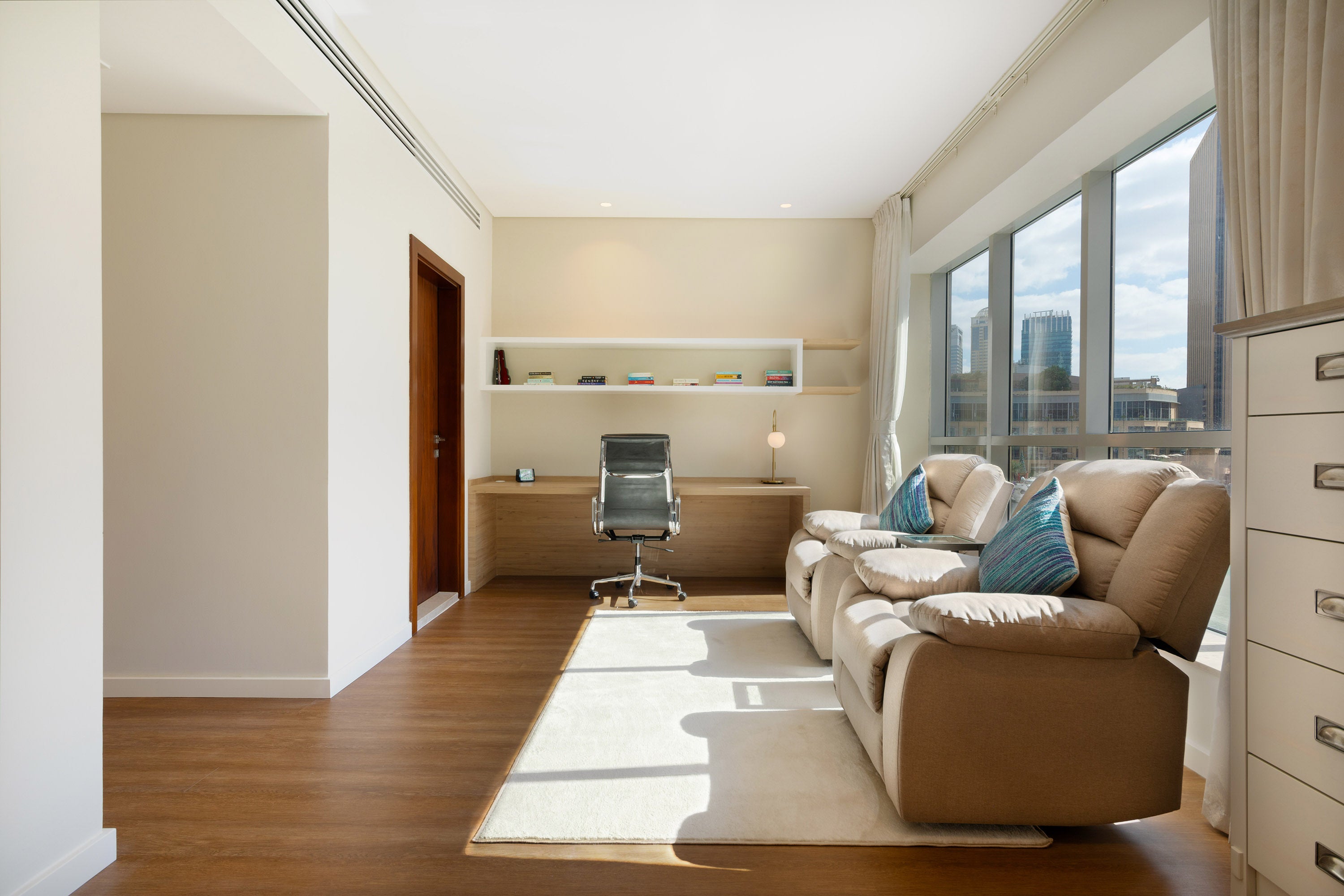 For a room that provides tranquillity and relaxation in all the right ways, relax and recoup in this stunning bedroom filled with art and character. Featuring a king-size tufted bed, contemporary side tables, and a modern work desk, this room really fails to disappoint. Wake up to breathtaking views of the Marina all from the comfort of this refined bedroom. Accented with sleek materials, the en suite bathroom is akin to a 5-star hotel and is beautifully appointed with a private bathtub and a walk-in shower.