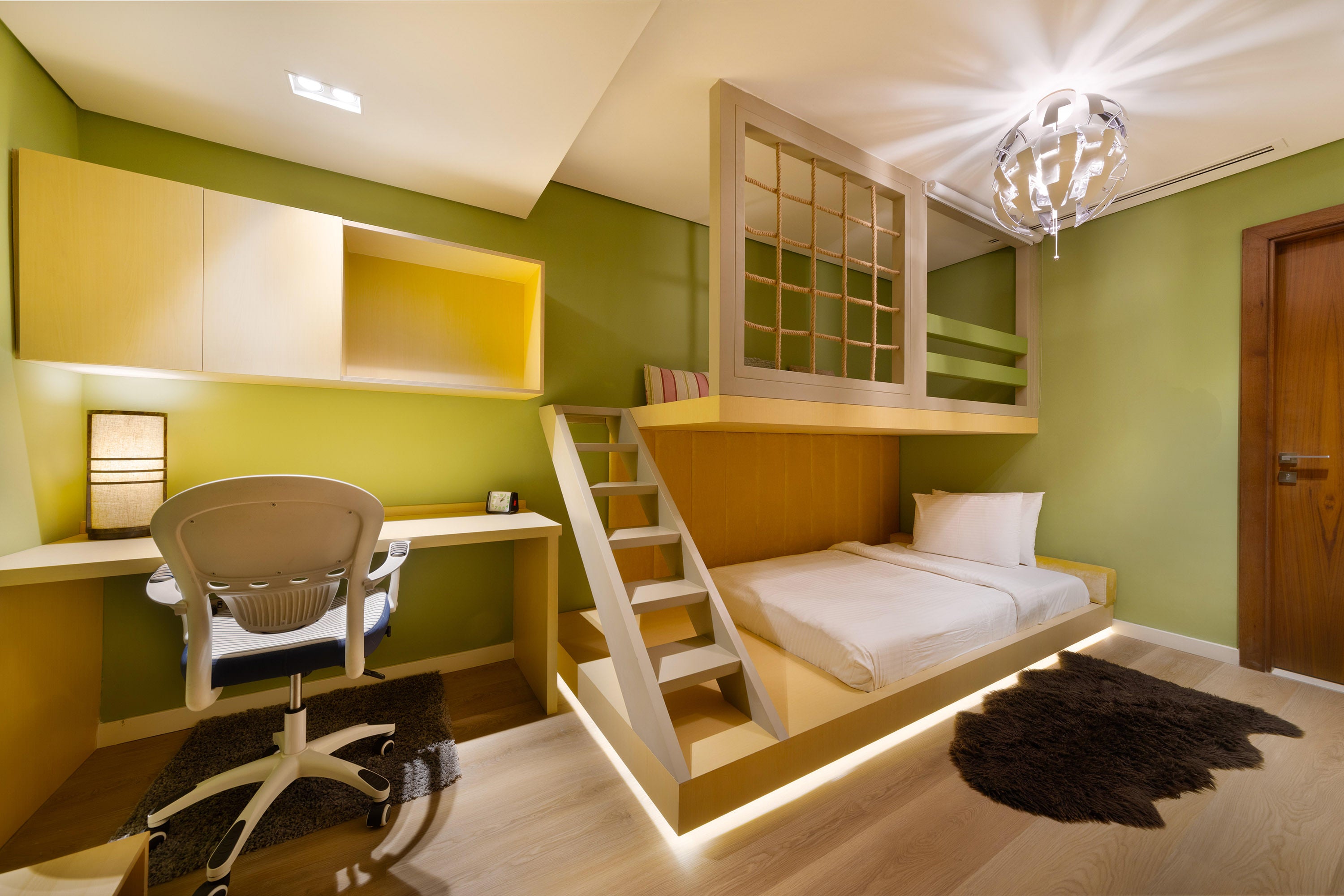 This beautiful villa also offers a colorful kid bedroom to accommodate an additional child. This room features a single bed and it’s wrapped in a jungle-themed decor. The en suite bathroom is elegantly chic with a modern basin, a large walk-in shower, and a handheld showerhead.