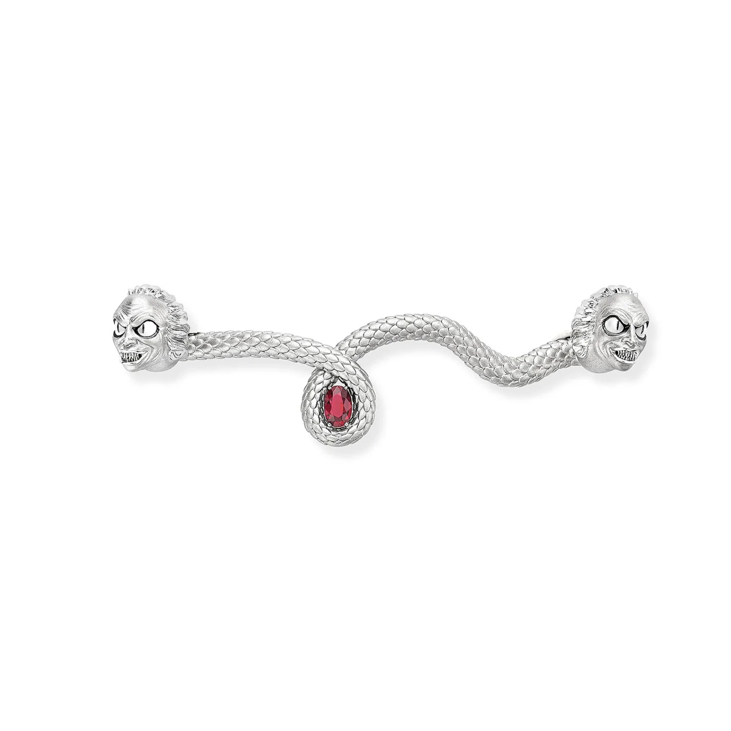 The Fabergé x Beetlejuice Beetlejuice White Gold and Emerald Twisted Headworm Collar Bar features the miniature heads of the Headworm, the eerie Beetlejuice character. Set in 18k white gold, the bar is a snake skin like texture with a responsibly mined oval-shaped Gemfields Zambian emerald at the centre. The heads feature white UV enamel and black rhodium around the eyes.