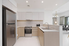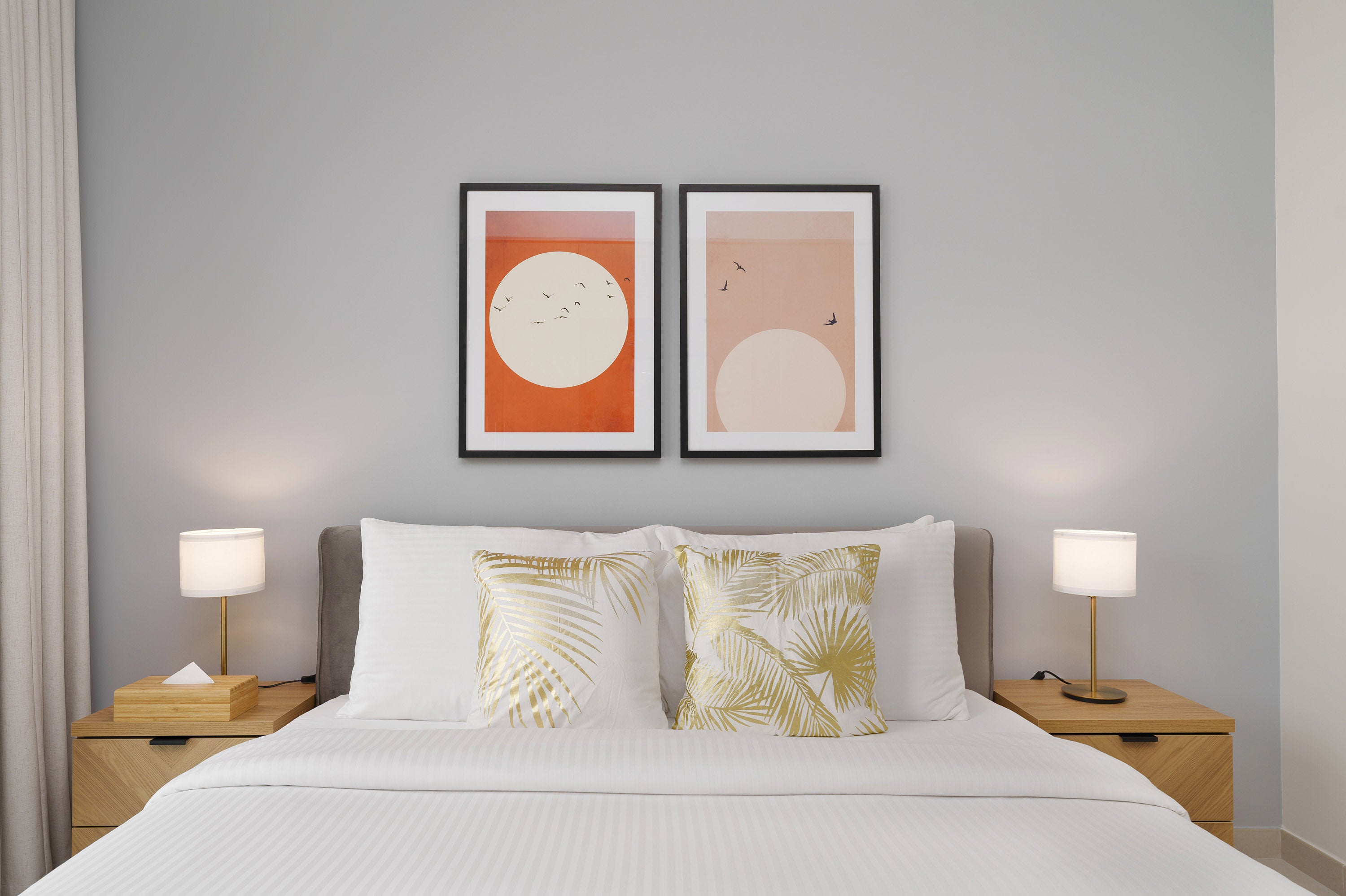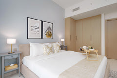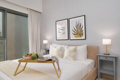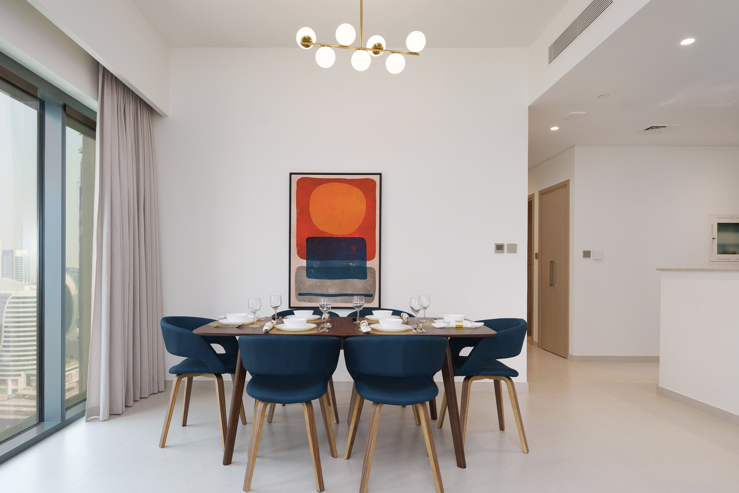 Immerse yourself in a contemporary minimalist setting adorned with pastel hues and geometric patterns that harmoniously complement the surroundings. The interior is thoughtfully furnished with a graceful modern sofa, a stylish coffee table, and a wooden TV unit that adds a lush touch to the ambience. Within this open space, you’ll find an exquisite dining area, comfortably accommodating up to six people. The exceptional property also boasts its own dedicated kitchen area, equipped with all the essential appliances to ensure a seamless stay. Furthermore, the living room provides access to a furnished balcony, where guests can savor their morning coffee or evening cocktails while marveling at the breathtaking views of Burj Khalifa and Downtown Dubai.