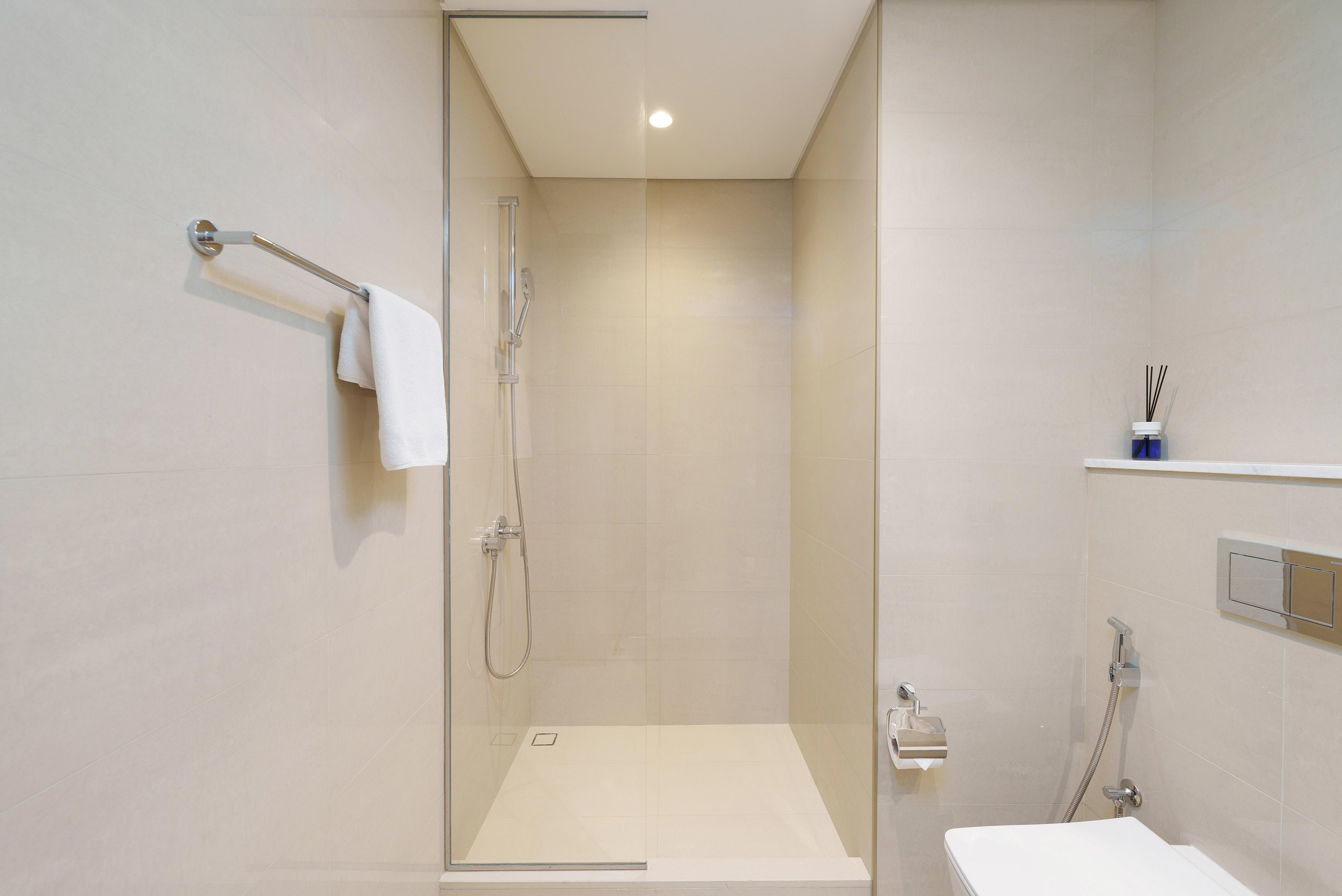 The room features an opulent king-size bed adorned with luxurious velvet, accompanied by trendy bedside tables and elegant table lamps, guaranteeing a truly delightful experience. Enjoy the delightful sights of Downtown Dubai right from the comfort of this modern bedroom. Adding to the overall comfort is the en suite bathroom offers a spa-like ambience, complete with a large rainfall shower, and a sleek vanity unit, allowing you to indulge in ultimate relaxation.